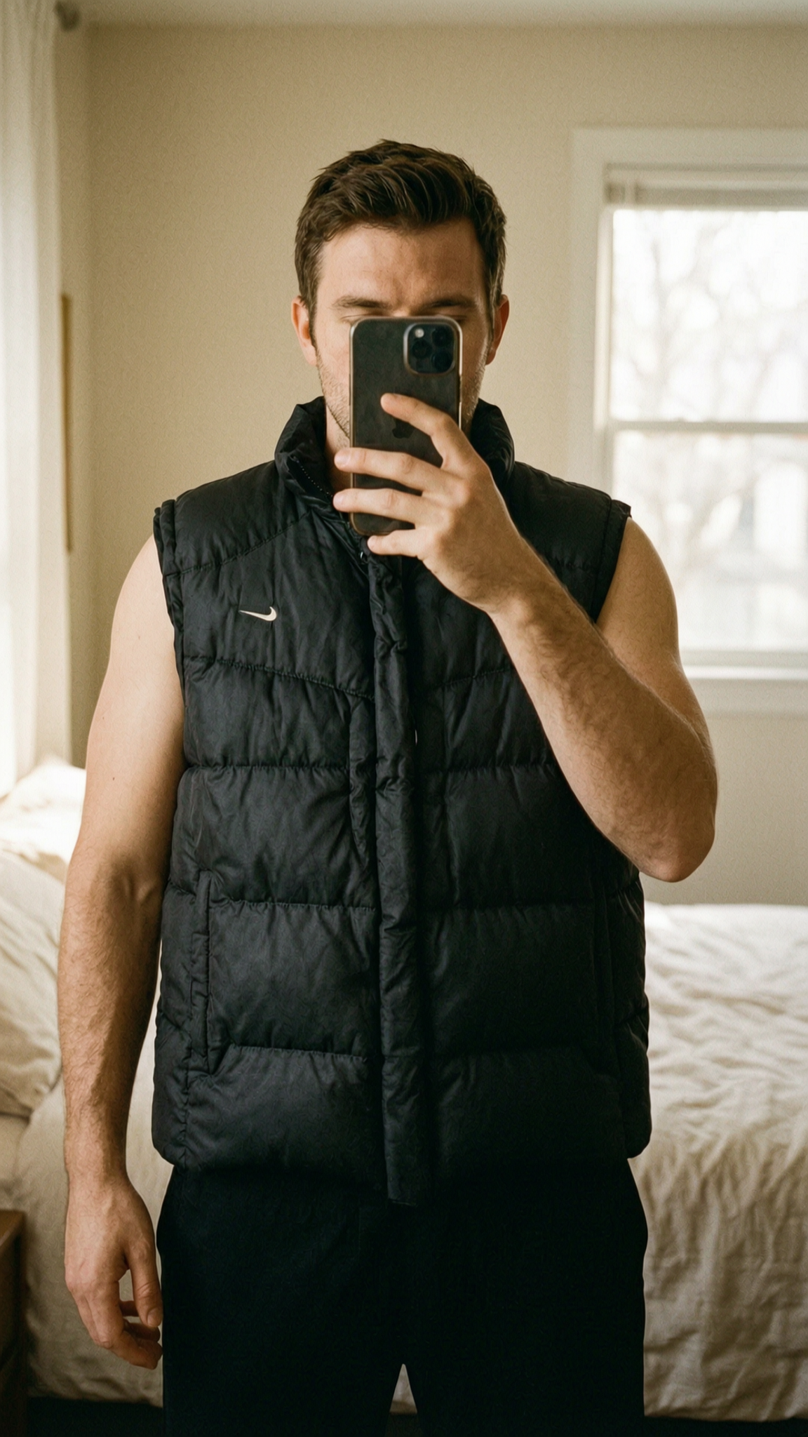 Vintage Nike Weste schwarz aufrecht stehend, der Kamera zugewandt, in einem sanft beleuchteten Schlafzimmer, mit natürlichem Licht, das durch ein Fenster fällt.