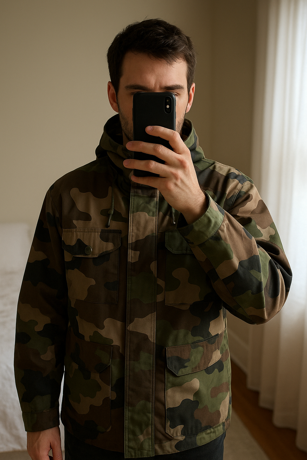 Vrai Gore-Tex Militaire taille 96C (M) en très bon état debout, face à la caméra, dans une chambre à la lumière douce, avec une lumière naturelle filtrant par la fenêtre.