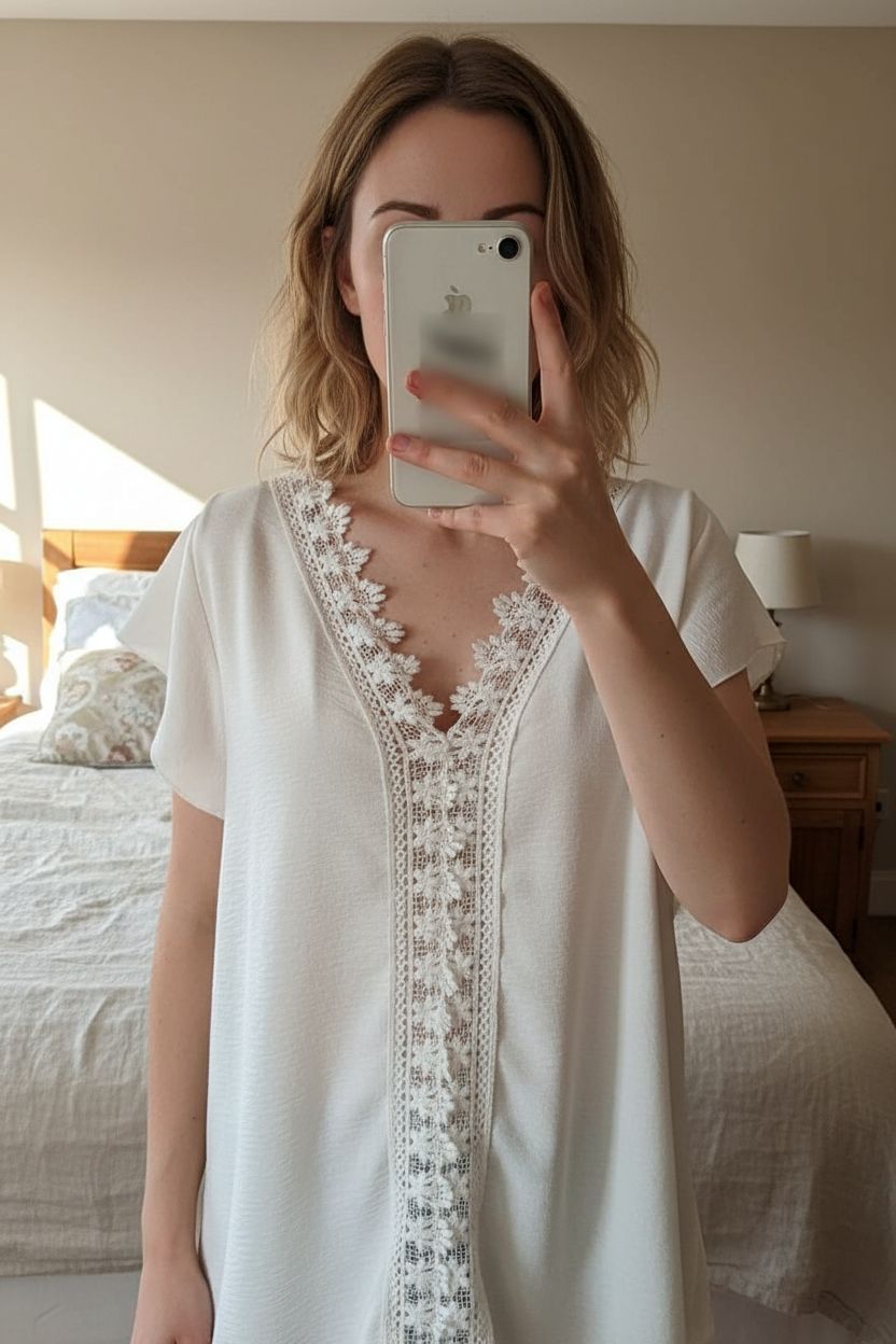 Weiße Bluse mit Spitze – leicht durchsichtig, boho, sommerlich Größe L aufrecht stehend, der Kamera zugewandt, in einem sanft beleuchteten Schlafzimmer, mit natürlichem Licht, das durch ein Fenster fällt.