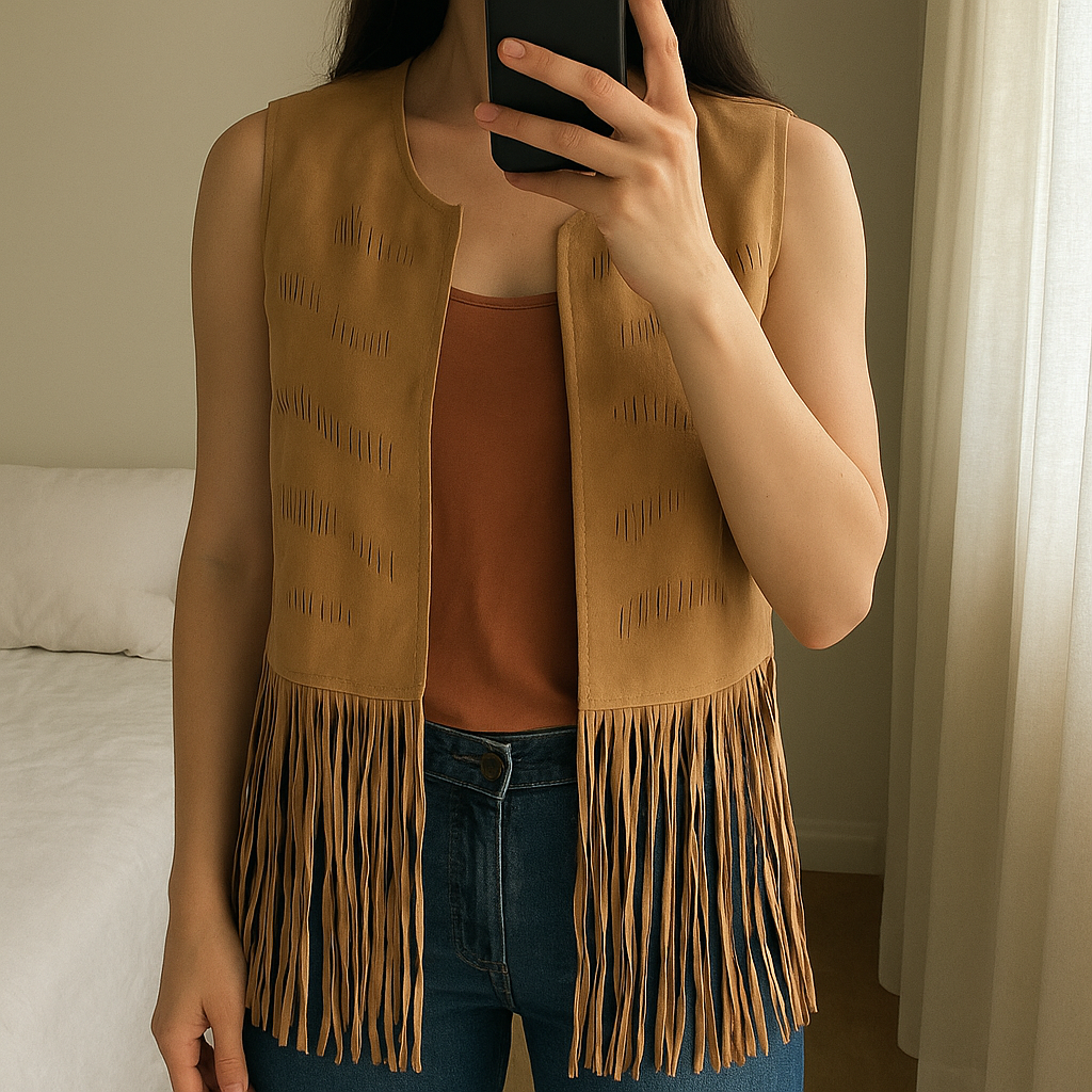 Weste Boho aufrecht stehend, der Kamera zugewandt, in einem sanft beleuchteten Schlafzimmer, mit natürlichem Licht, das durch ein Fenster fällt.