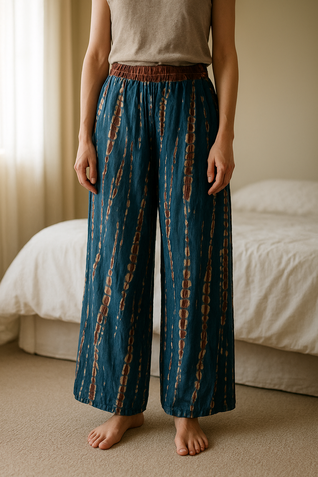 Wide leg trousers em pé, de frente para a câmera, em um quarto com iluminação suave e luz natural filtrando pela janela.