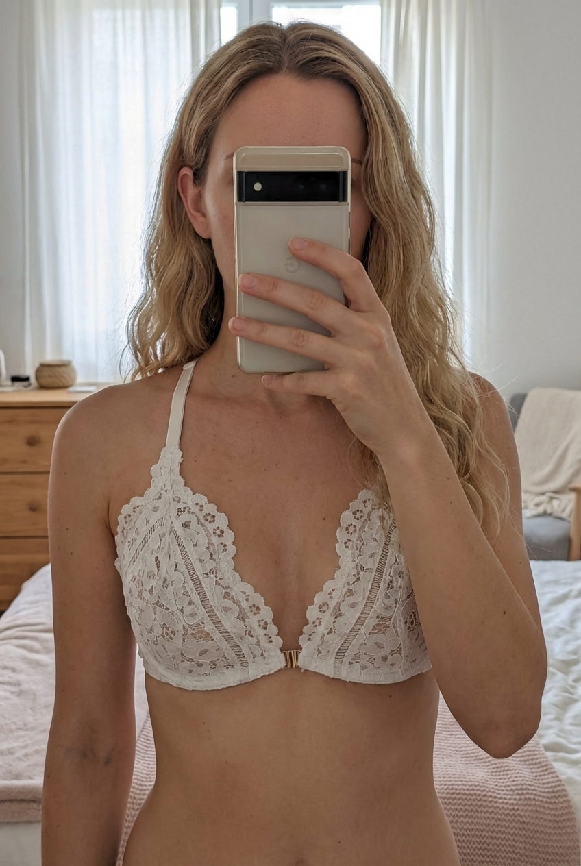 Wunderschöner BH mit Frontverschluss | Gr. 70 F / 32 DD aufrecht stehend, der Kamera zugewandt, in einem sanft beleuchteten Schlafzimmer, mit natürlichem Licht, das durch ein Fenster fällt.