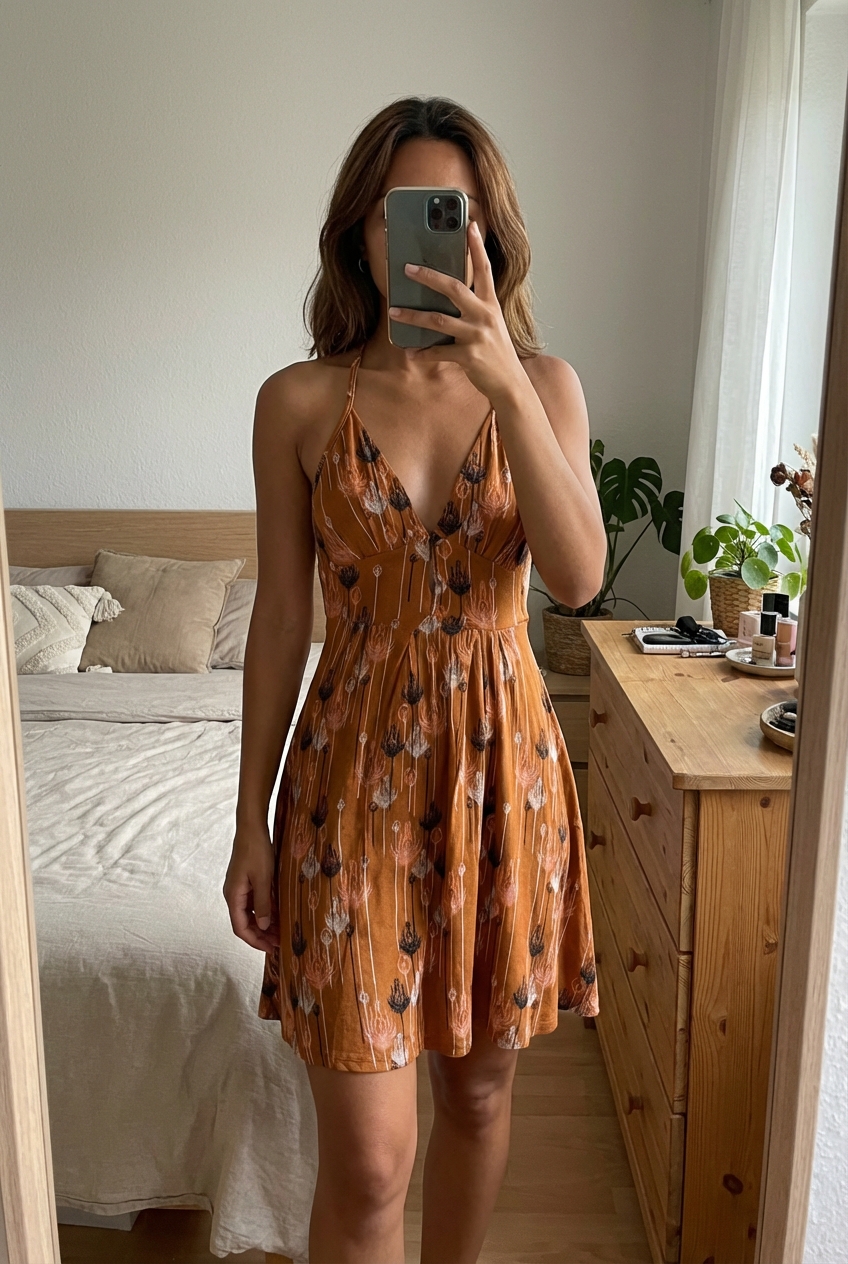 Eine Person in Wunderschönes, einzigartiges Neckholder Kleid | Gr. XS aufrecht stehend, der Kamera zugewandt, mit schlanker Figur, in einem sanft beleuchteten Schlafzimmer, mit natürlichem Licht, das durch ein Fenster fällt.