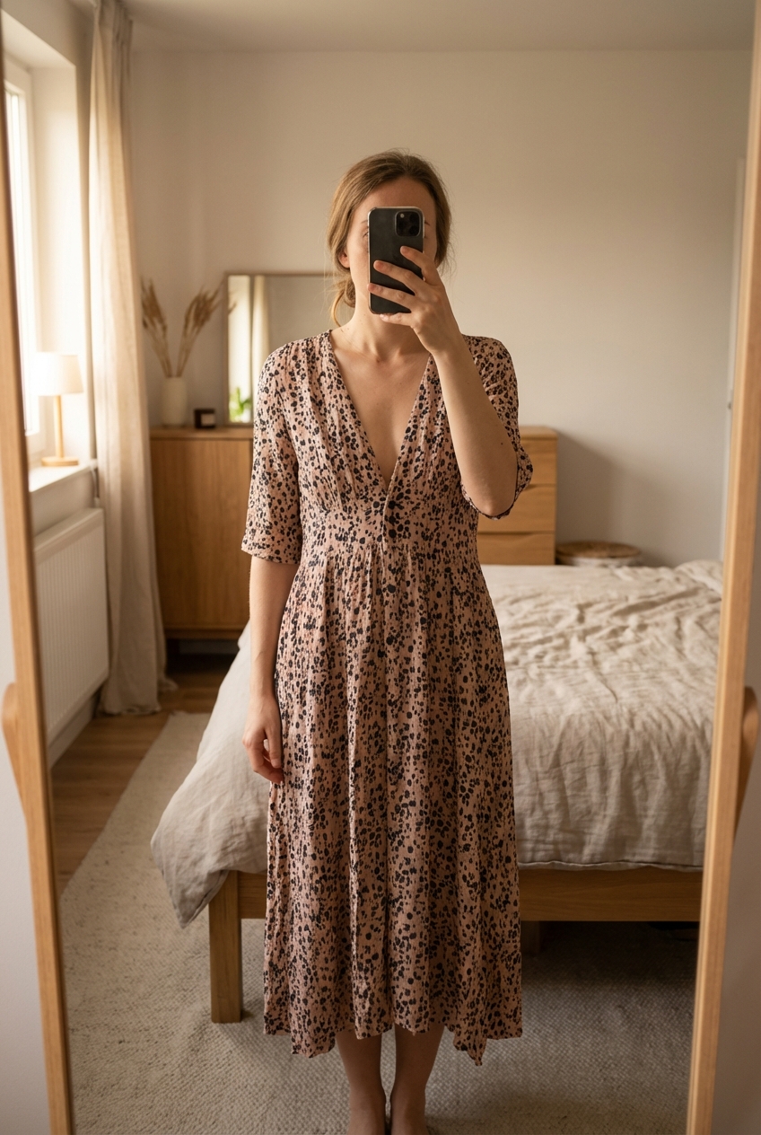 Wunderschönes Kleid mit Leo-Print | Gr. 36 aufrecht stehend, der Kamera zugewandt, in einem sanft beleuchteten Schlafzimmer, mit natürlichem Licht, das durch ein Fenster fällt.