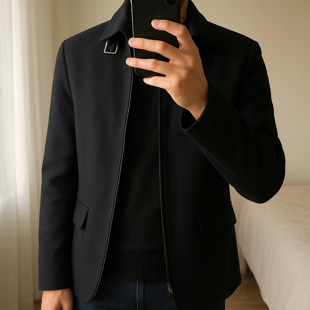 Zara inter blazer/jacket de pie, mirando a la cámara, en un dormitorio con luz suave y natural filtrándose por la ventana.