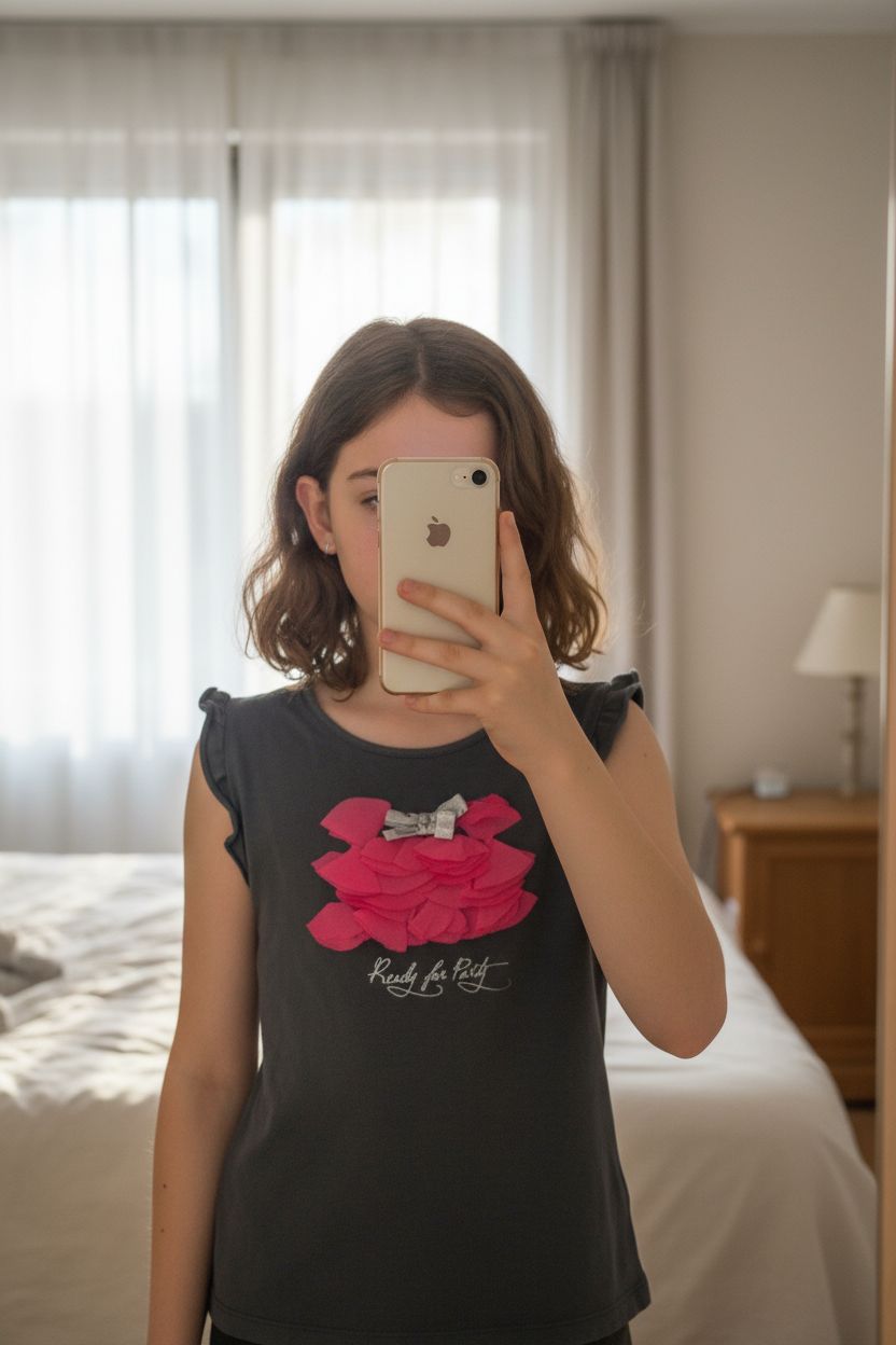 Zara Kids Shirt Gr. 104 in Anthrazit mit pinker Blüten-Applikation aufrecht stehend, der Kamera zugewandt, in einem sanft beleuchteten Schlafzimmer, mit natürlichem Licht, das durch ein Fenster fällt.