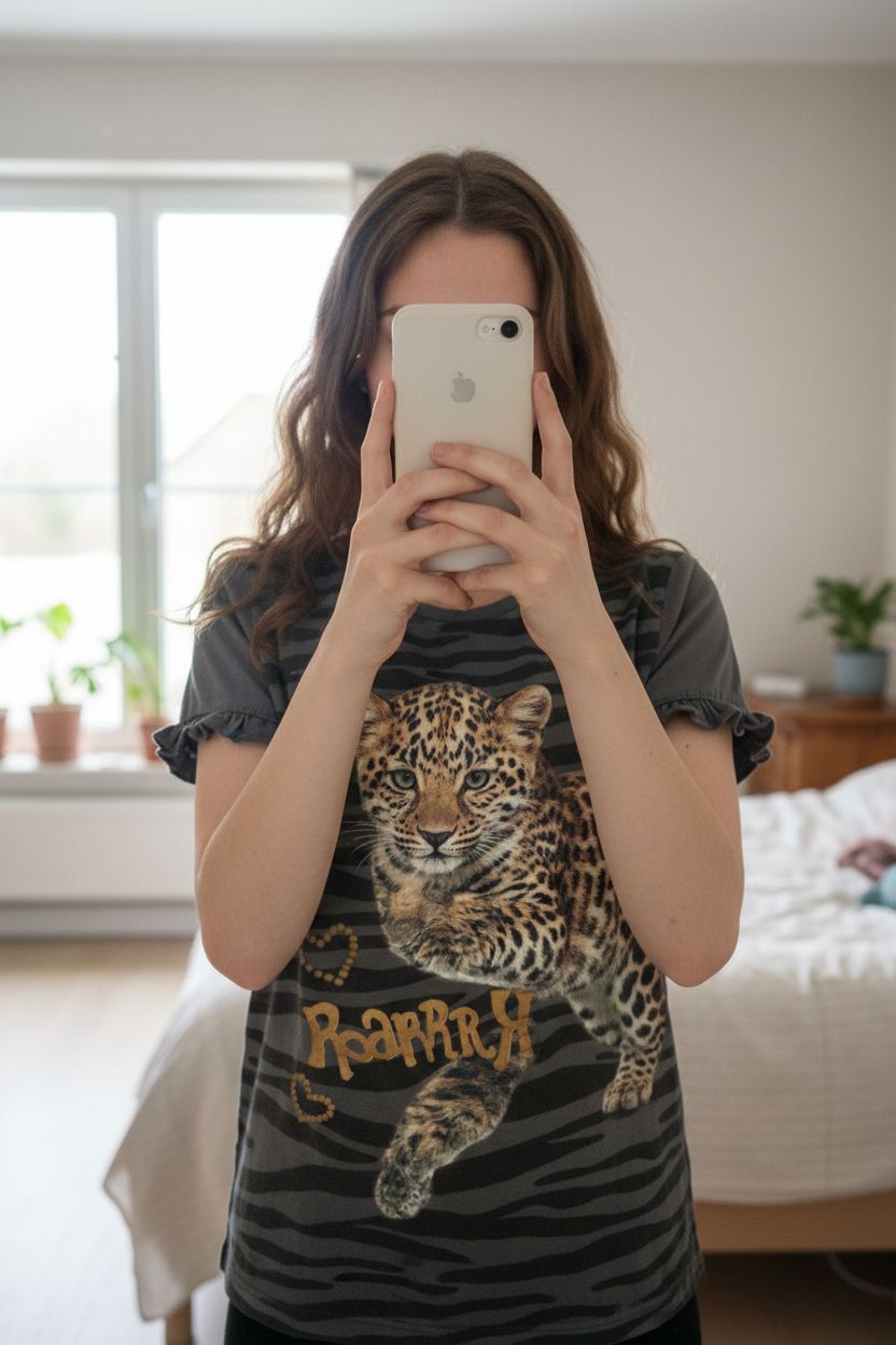 Zara Kids T-Shirt Gr. 92 Leo Print mit Herzen und Rüschen aufrecht stehend, der Kamera zugewandt, in einem sanft beleuchteten Schlafzimmer, mit natürlichem Licht, das durch ein Fenster fällt.