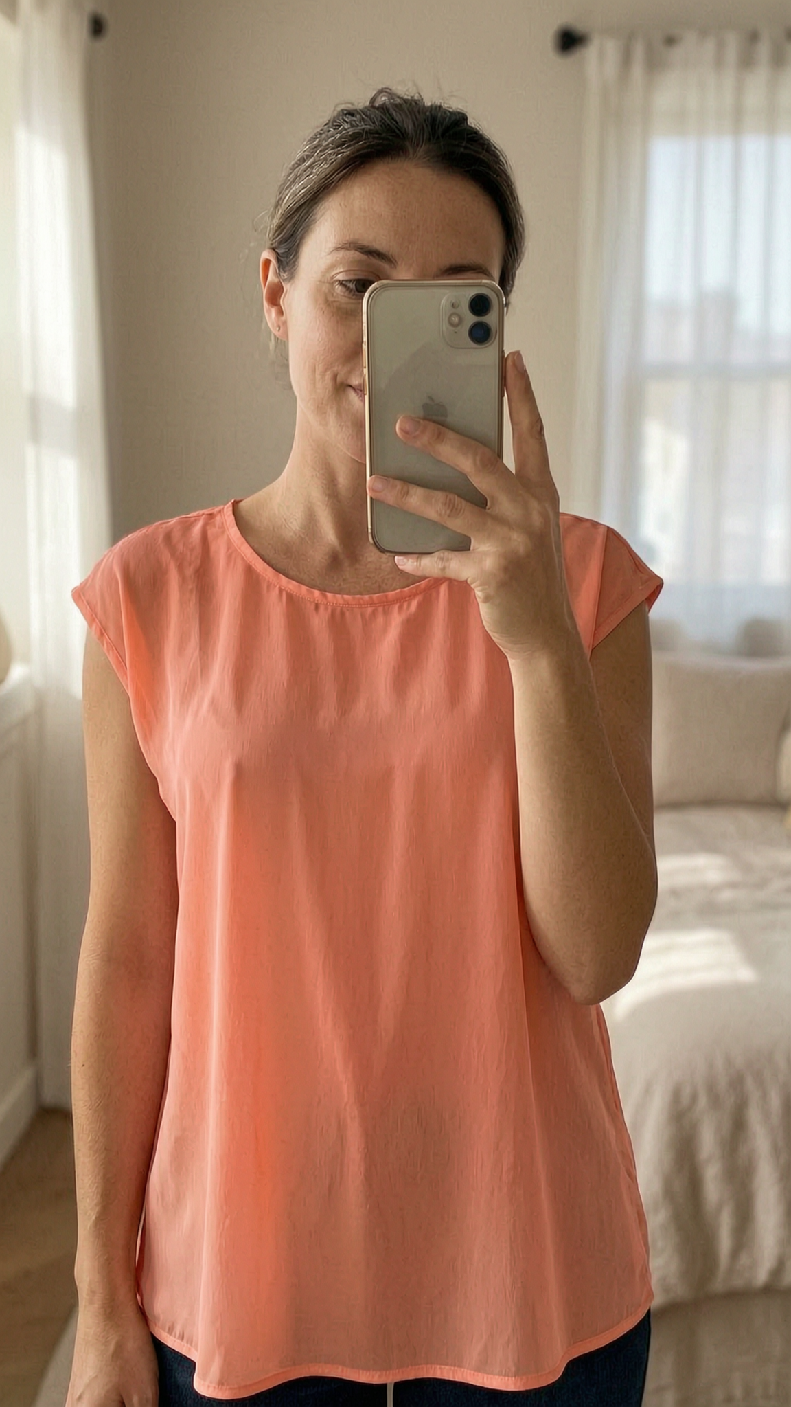 Eine Person in Zartes Chiffon-Top Apricot/Coral – locker fallend, leicht transparent & sommerlich Größe M/L aufrecht stehend, der Kamera zugewandt, in einem sanft beleuchteten Schlafzimmer, mit natürlichem Licht, das durch ein Fenster fällt.