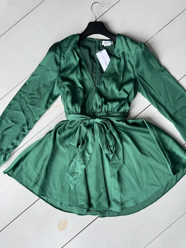 Green long summer dress standing straight facing the camera, in a softly lit bedroom setting, with gentle natural light filtering through a window.