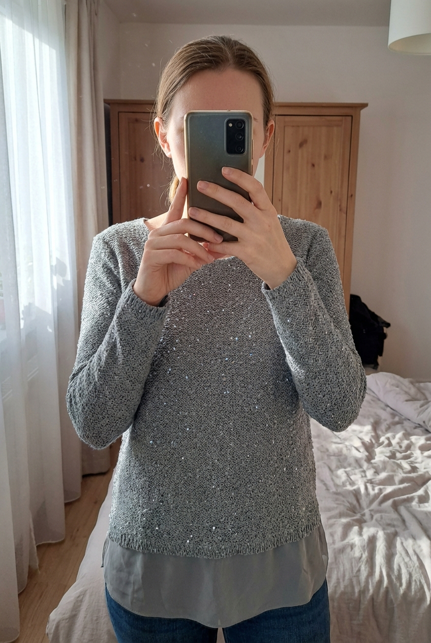 Grey Knit Sweater (XS) aufrecht stehend, der Kamera zugewandt, in einem sanft beleuchteten Schlafzimmer, mit natürlichem Licht, das durch ein Fenster fällt.