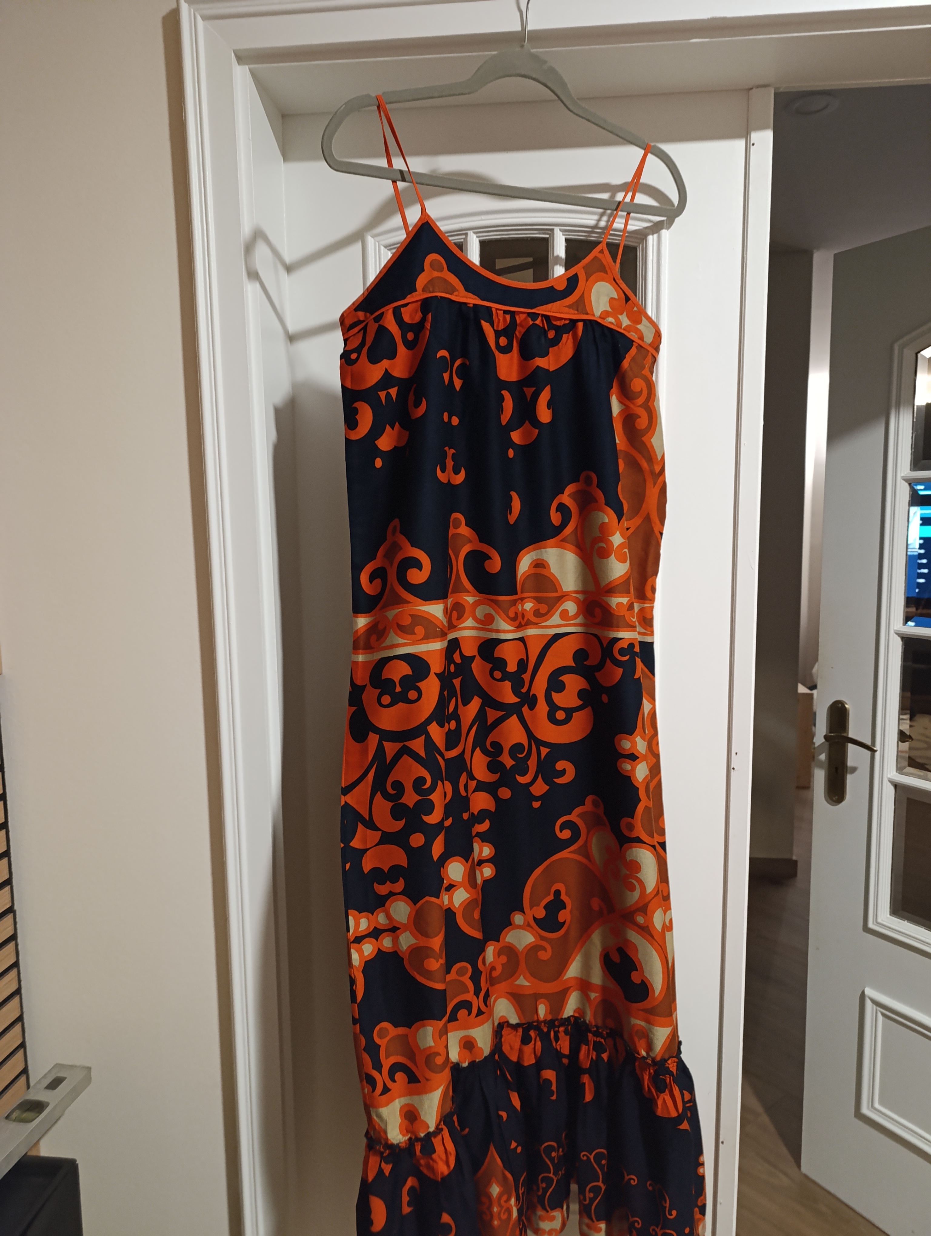 Robe Sandro – Taille 3 (équivalent M) debout, face à la caméra, dans une chambre à la lumière douce, avec une lumière naturelle filtrant par la fenêtre.
