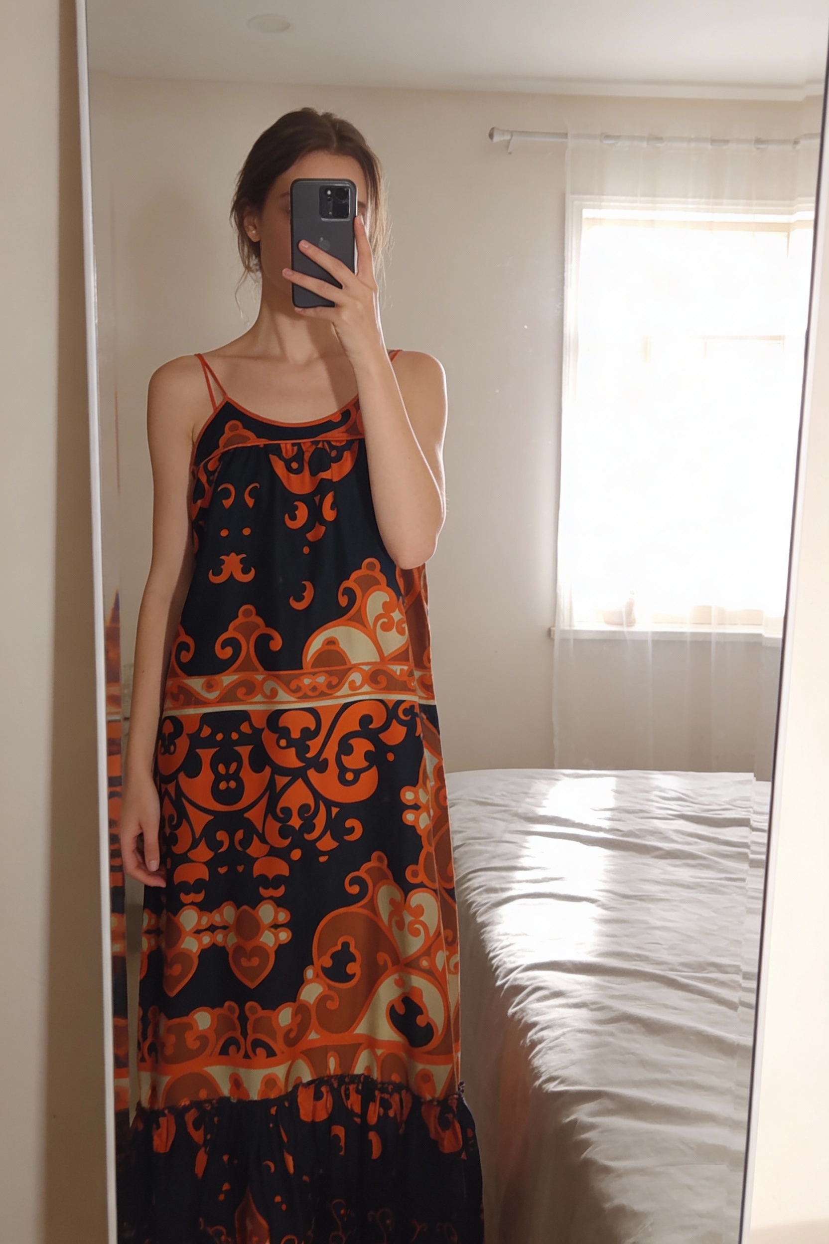 Robe zara fluide debout, face à la caméra, dans une chambre à la lumière douce, avec une lumière naturelle filtrant par la fenêtre.