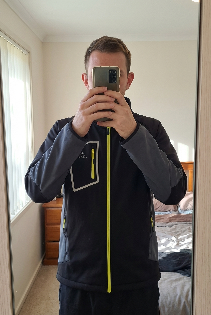 Sweat chaud noir pour hivers, décathlon, tres bon etat debout, face à la caméra, dans une chambre à la lumière douce, avec une lumière naturelle filtrant par la fenêtre.