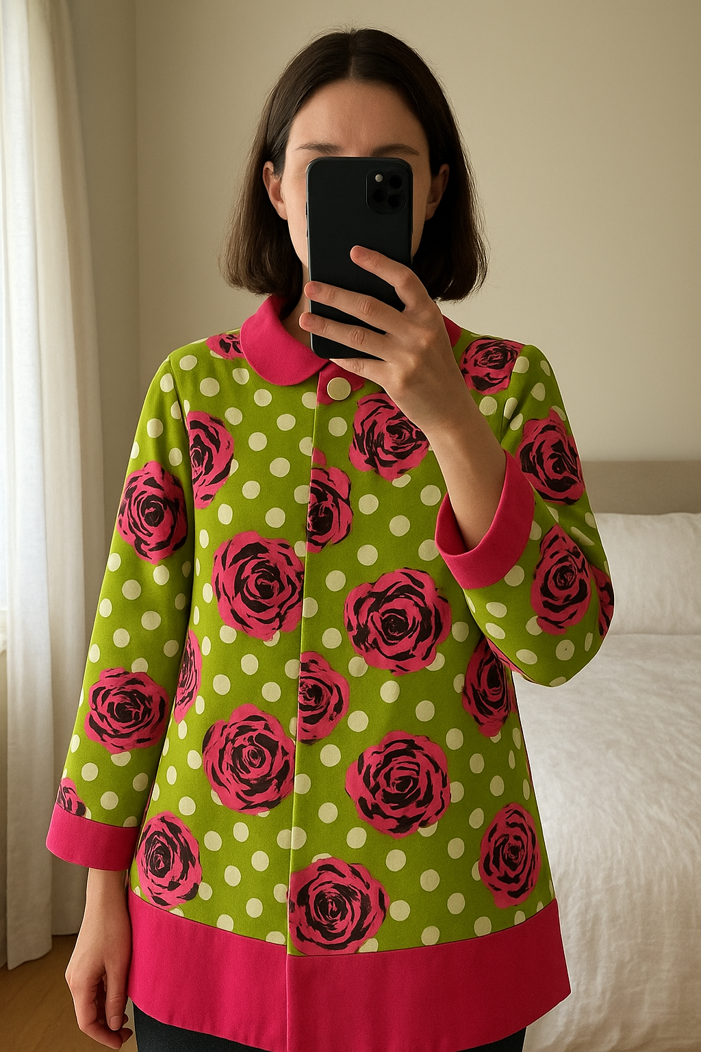 1/2 season coat. standing straight facing the camera, in a softly lit bedroom setting, with gentle natural light filtering through a window.