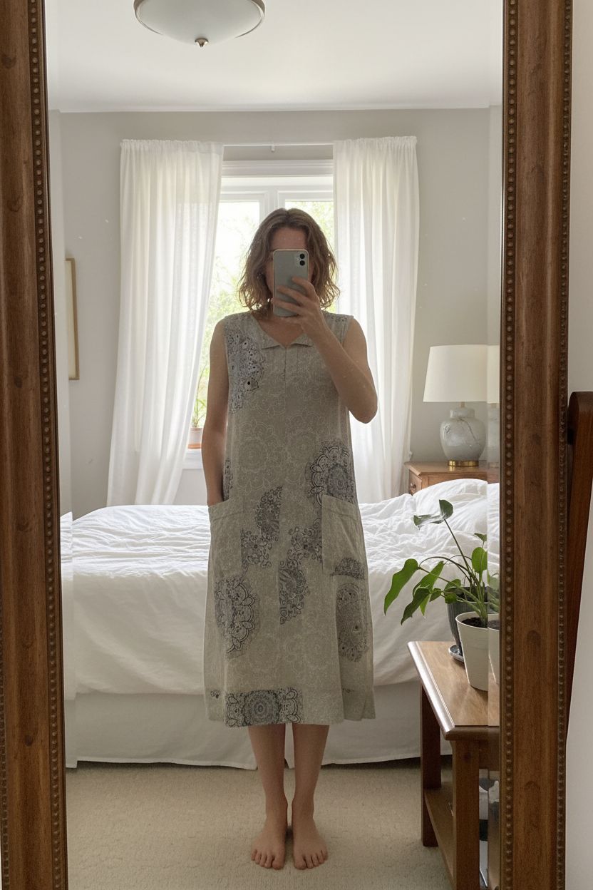 A person in 100% linen Italian made sleeveless shift dress knee length with pockets size S/M fits 10-12 standing straight facing the camera, in a softly lit bedroom setting, with gentle natural light filtering through a window.