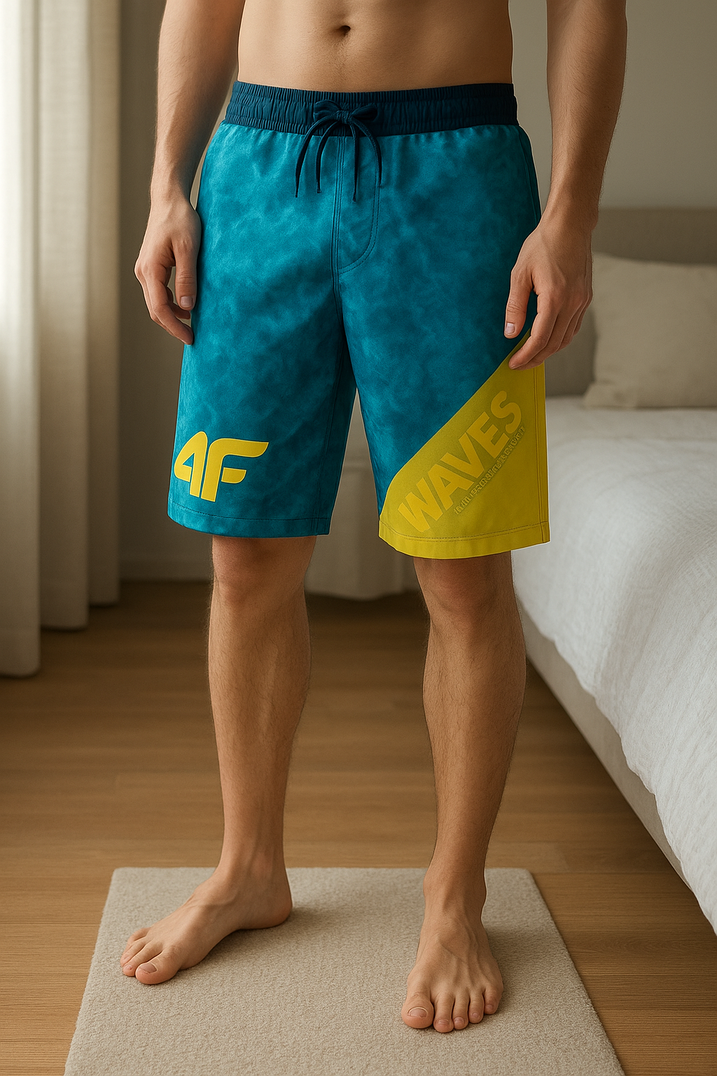 4F Męskie Spodnie Sportowe Granatowe – Wygodne i Stylowe standing straight facing the camera, in a softly lit bedroom setting, with gentle natural light filtering through a window.