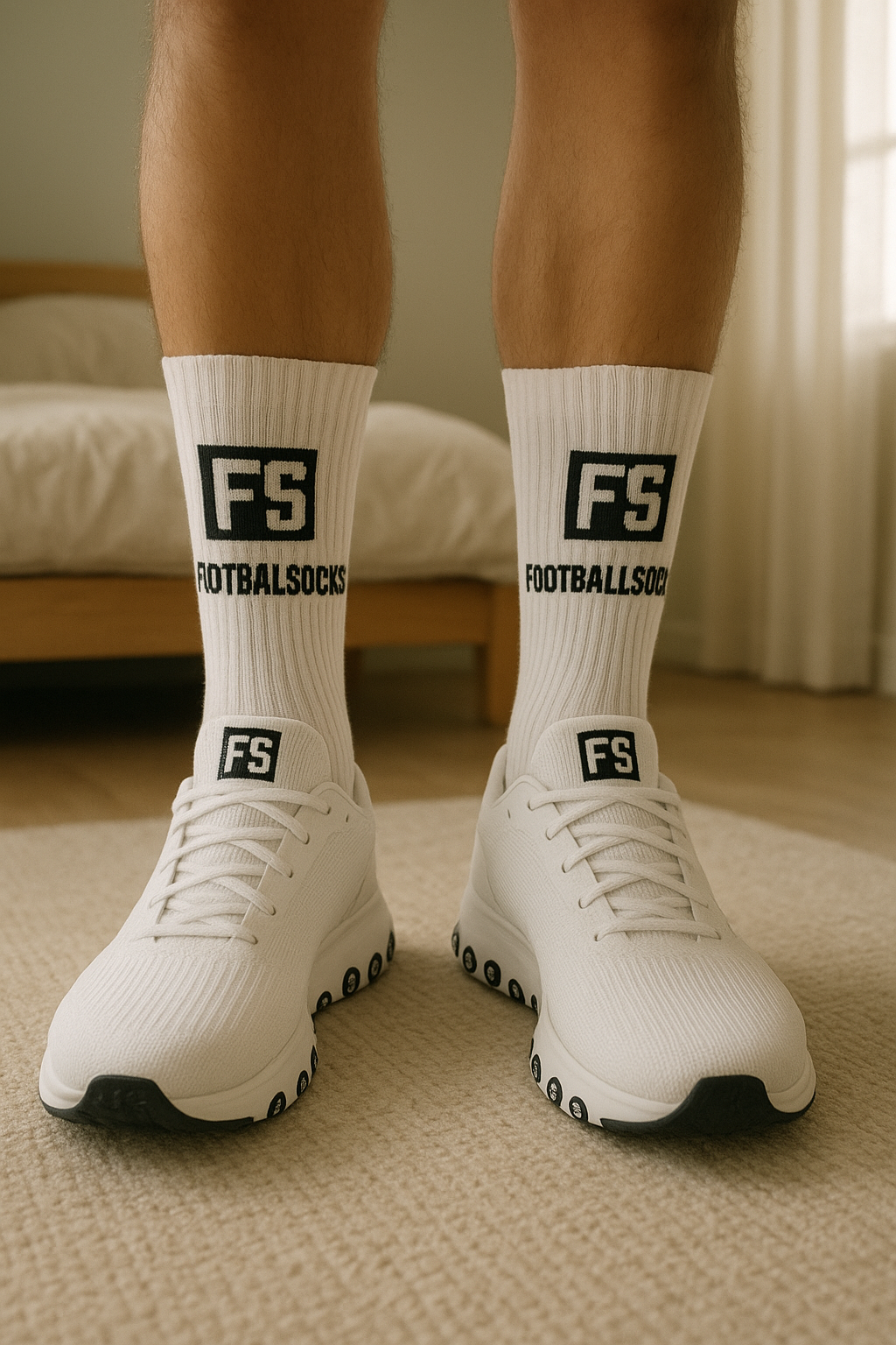 6 new pairs of socks (38/42) debout, face à la caméra, dans une chambre à la lumière douce, avec une lumière naturelle filtrant par la fenêtre.