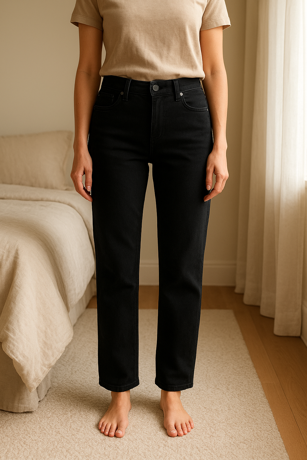 7 For All Mankind Women’s Black Stretch Low Rise Skinny Jeans - W31 L29 standing straight facing the camera, in a softly lit bedroom setting, with gentle natural light filtering through a window.