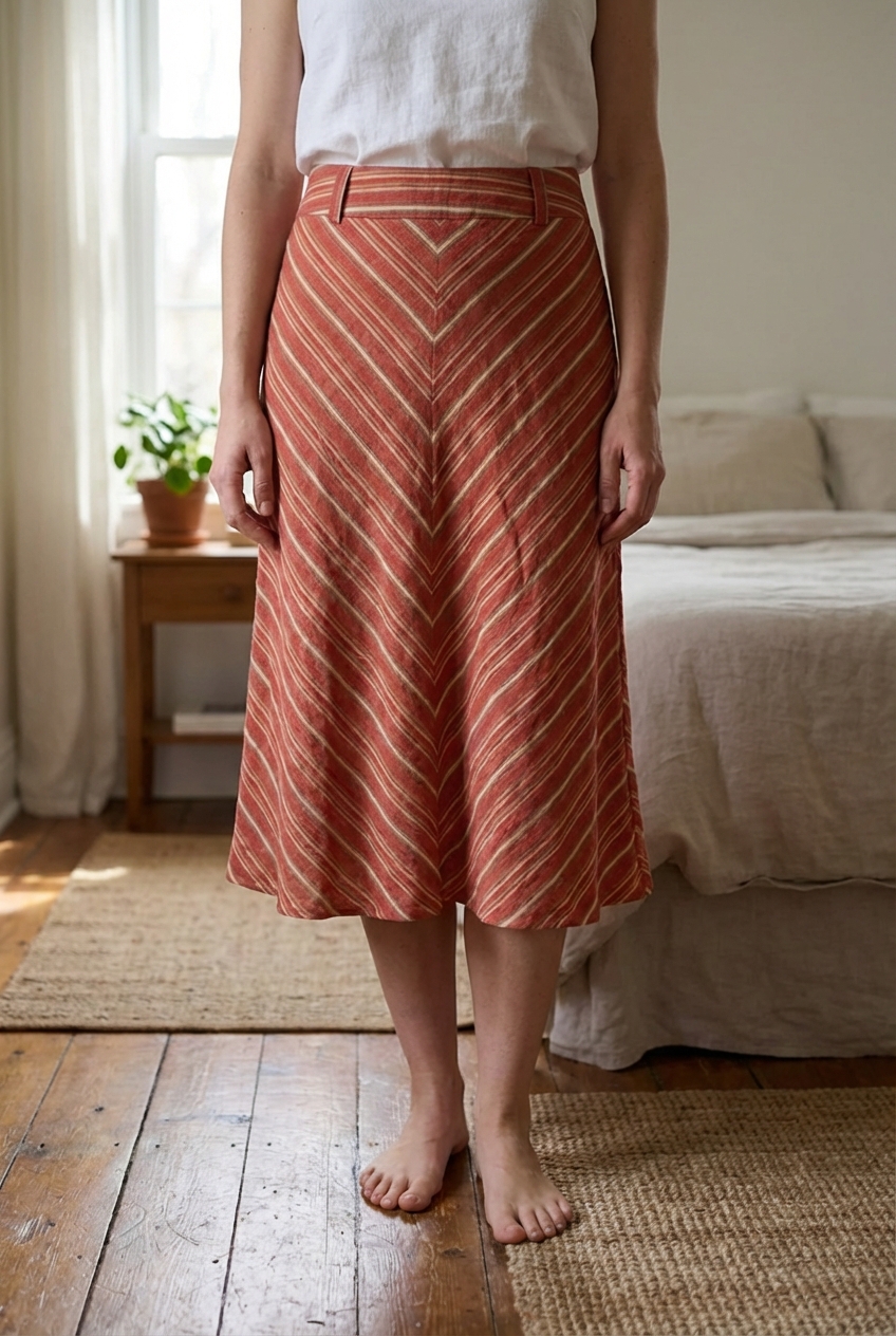 90s linen skirt standing straight facing the camera, in a softly lit bedroom setting, with gentle natural light filtering through a window.