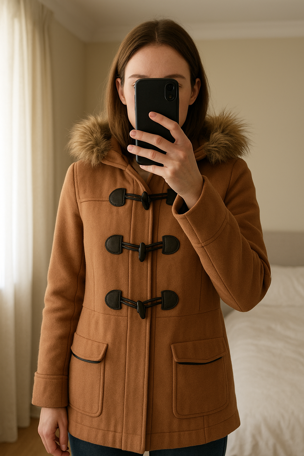 Abercrombie and fitch coat sz M standing straight facing the camera, in a softly lit bedroom setting, with gentle natural light filtering through a window.