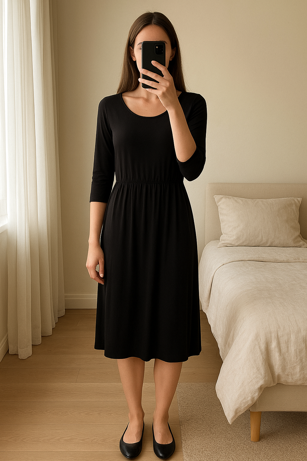 Abitino nero Terranova taglia M in piedi, rivolto verso la fotocamera, in una camera da letto con luce soffusa e luce naturale che filtra dalla finestra.