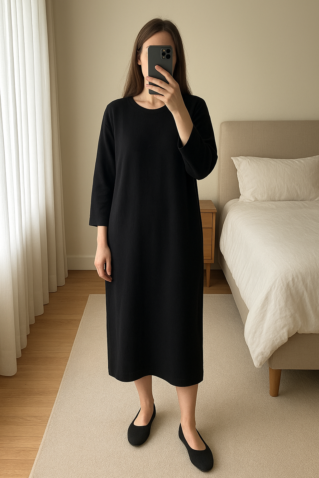 Abito nero donna Martino Midali a forma di tulipano– modello casual/elegante in piedi, rivolto verso la fotocamera, in una camera da letto con luce soffusa e luce naturale che filtra dalla finestra.