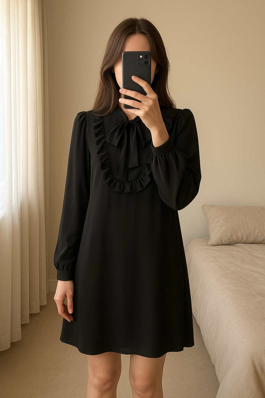 Abito oversize nero con fiocco taglia XS in piedi, rivolto verso la fotocamera, in una camera da letto con luce soffusa e luce naturale che filtra dalla finestra.
