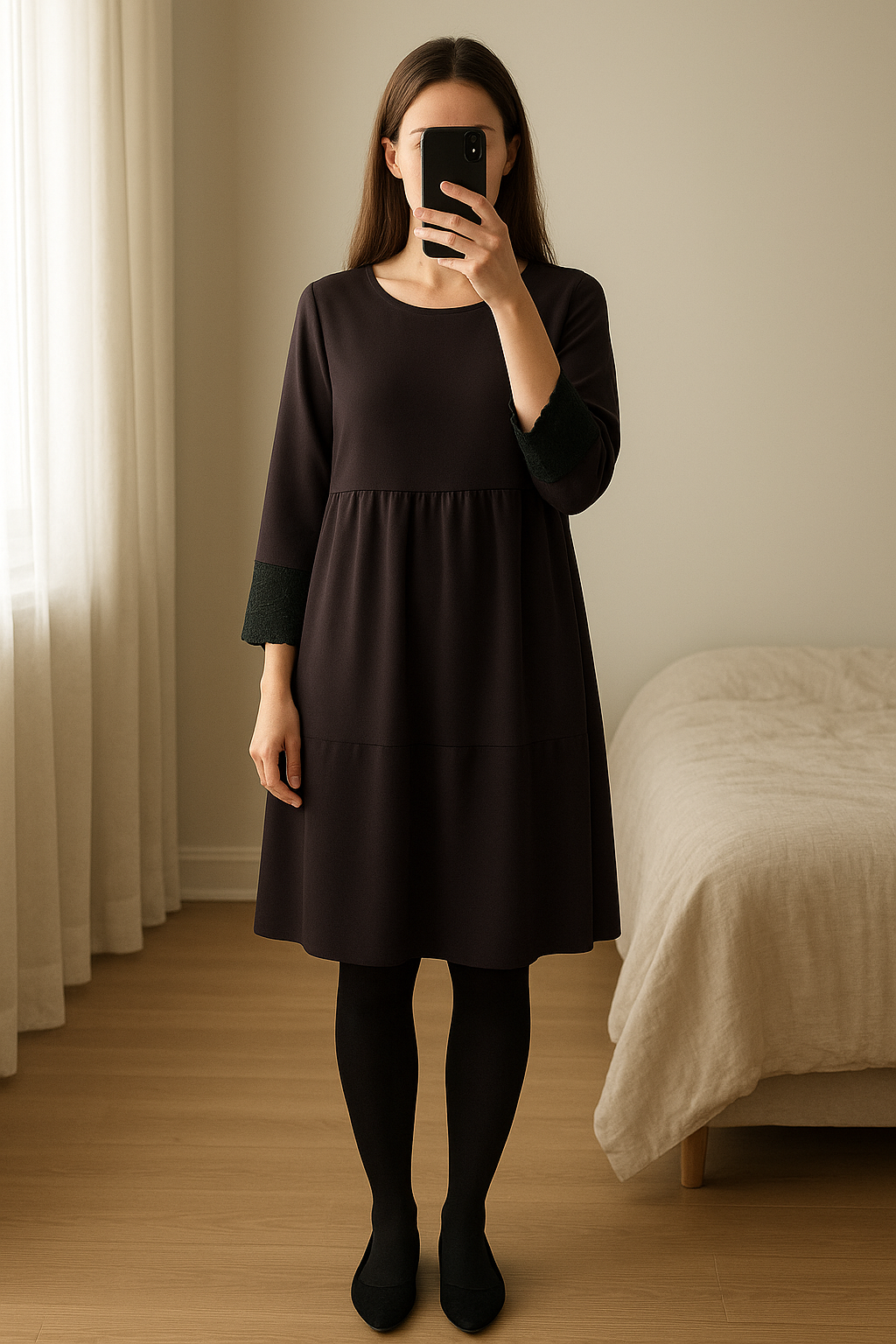 Abito viola Enjoy taglia M in piedi, rivolto verso la fotocamera, in una camera da letto con luce soffusa e luce naturale che filtra dalla finestra.
