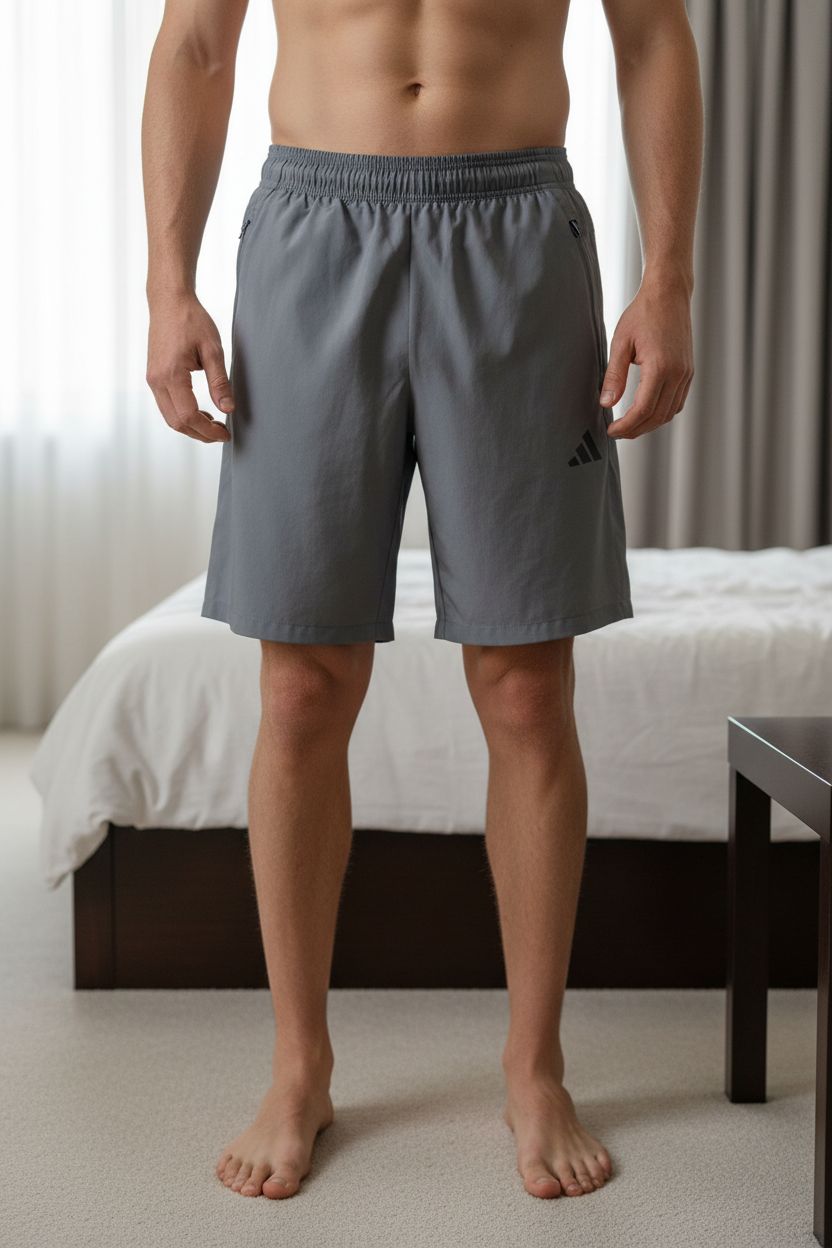 A person in Adidas Aeroready Grey Silky Shorts with Zipped Pockets size Medium standing straight facing the camera, in a softly lit bedroom setting, with gentle natural light filtering through a window.