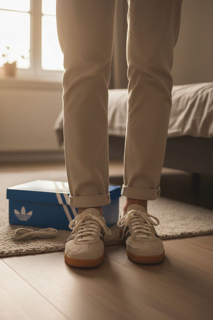 Adidas Handball spezial 39 1/3 JQ8903 standing straight facing the camera, in a softly lit bedroom setting, with gentle natural light filtering through a window.