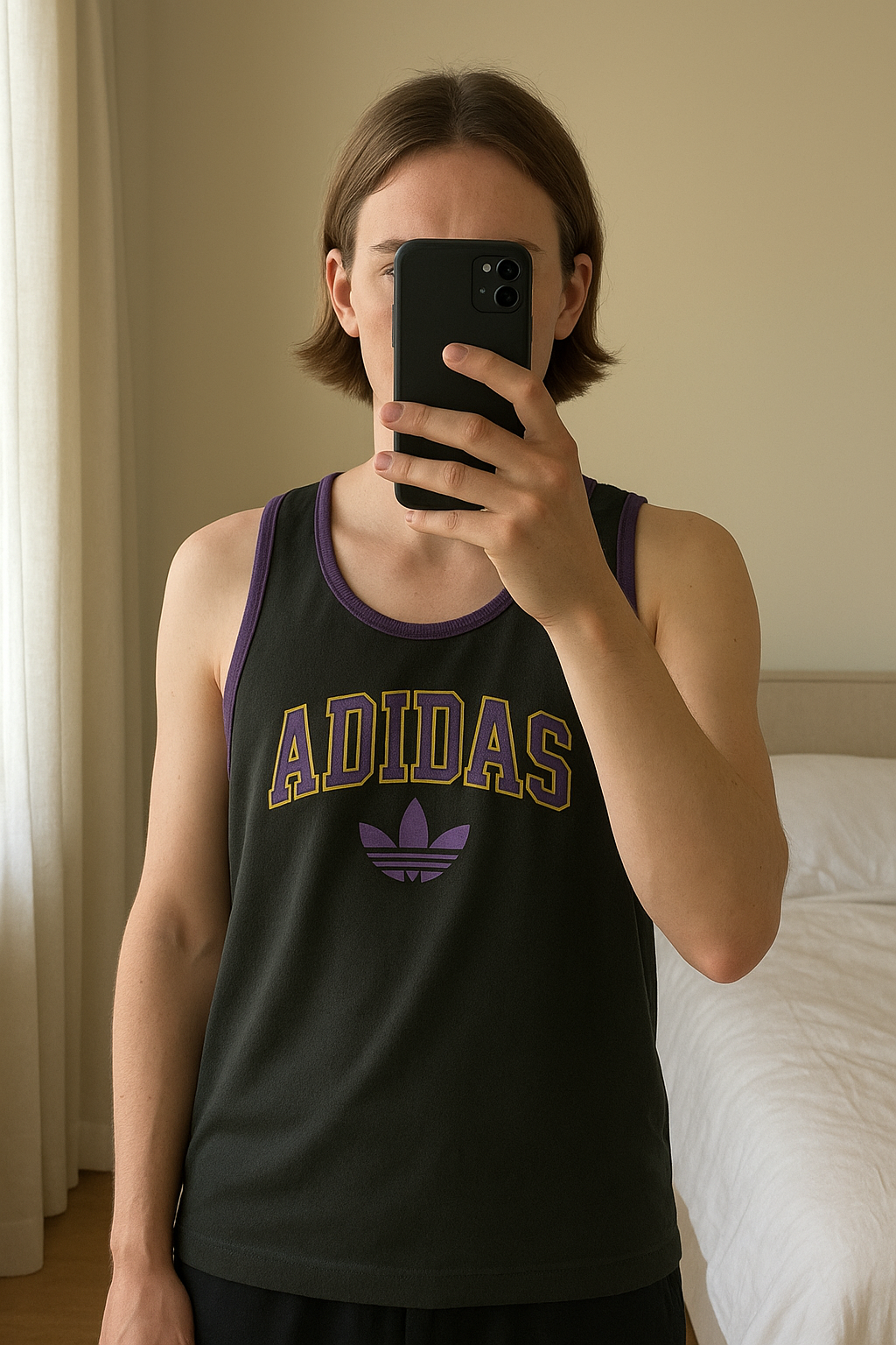 Adidas Originals Trefoil Vest Size 12 Loose Fit standing straight facing the camera, in a softly lit bedroom setting, with gentle natural light filtering through a window.