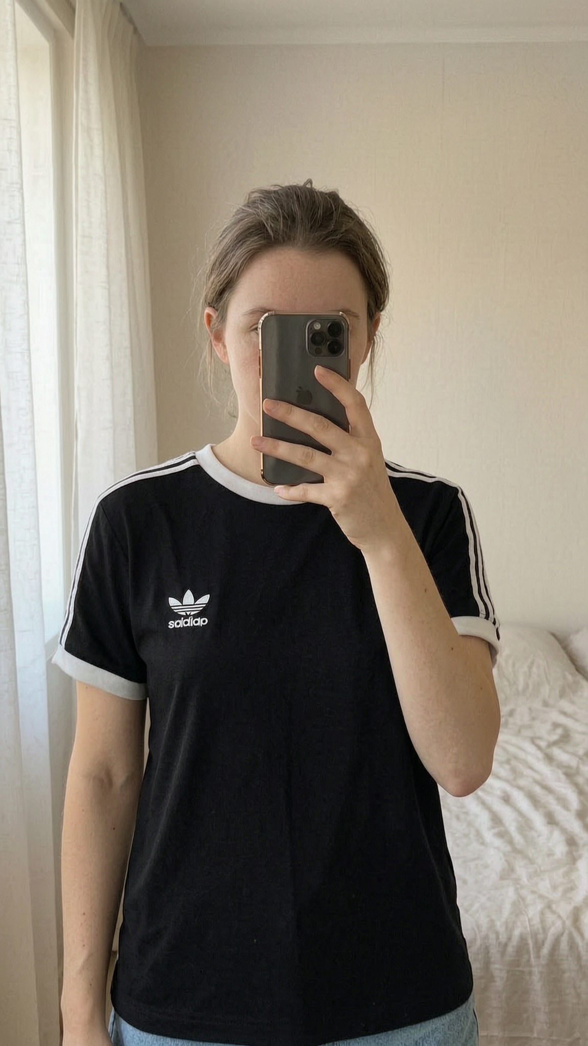 Adidas T-Shirt - Black - S standing straight facing the camera, in a softly lit bedroom setting, with gentle natural light filtering through a window.