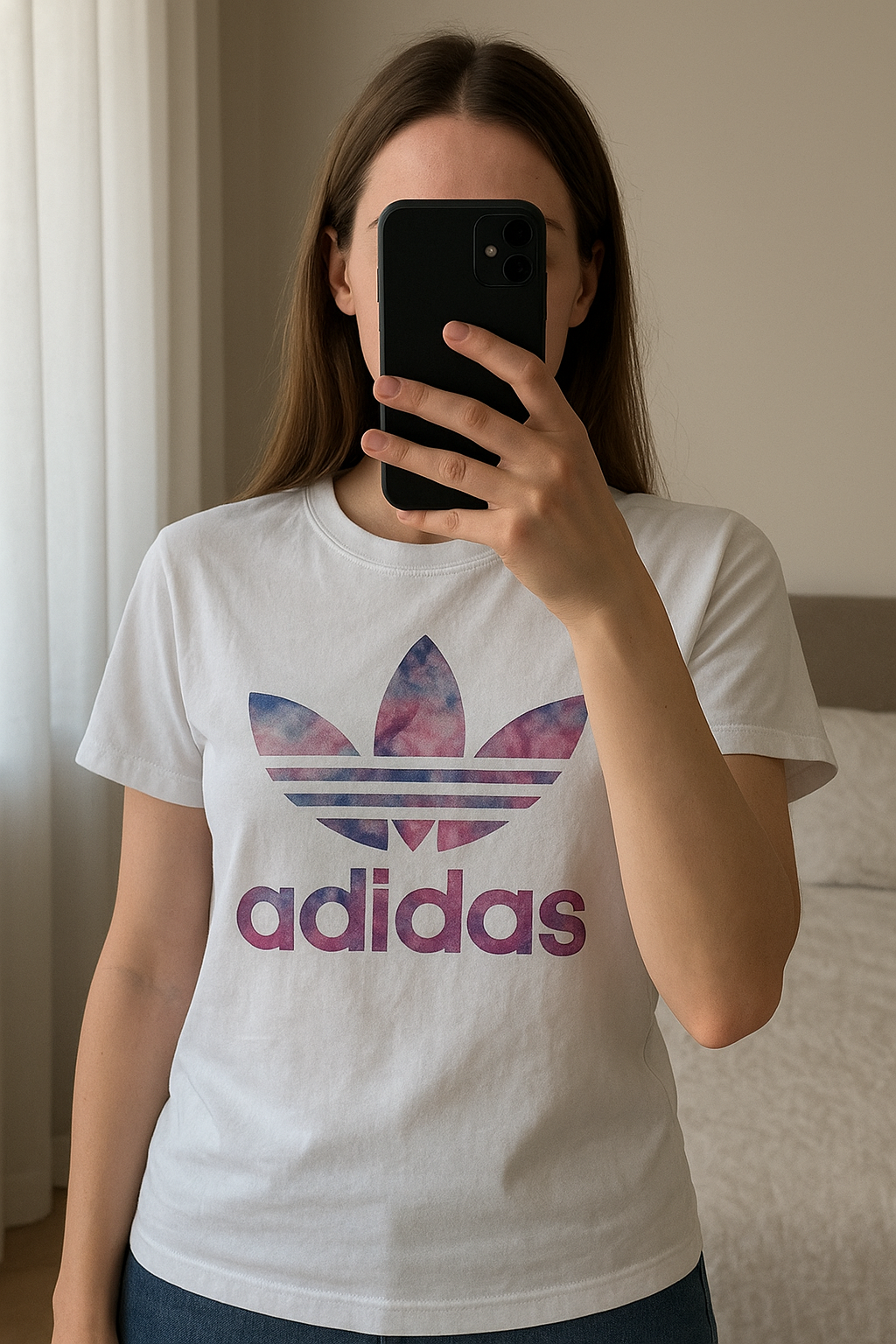 Adidas T-shirt size L worn twice standing straight facing the camera, in a softly lit bedroom setting, with gentle natural light filtering through a window.