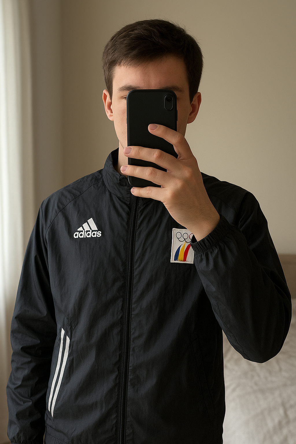 adidas • vintage • olympique • rare • coupe vent • debout, face à la caméra, dans une chambre à la lumière douce, avec une lumière naturelle filtrant par la fenêtre.