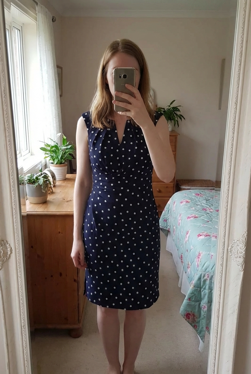 Adrianna Papell navy polka dot dress UK 12 occasion work standing straight facing the camera, in a softly lit bedroom setting, with gentle natural light filtering through a window.