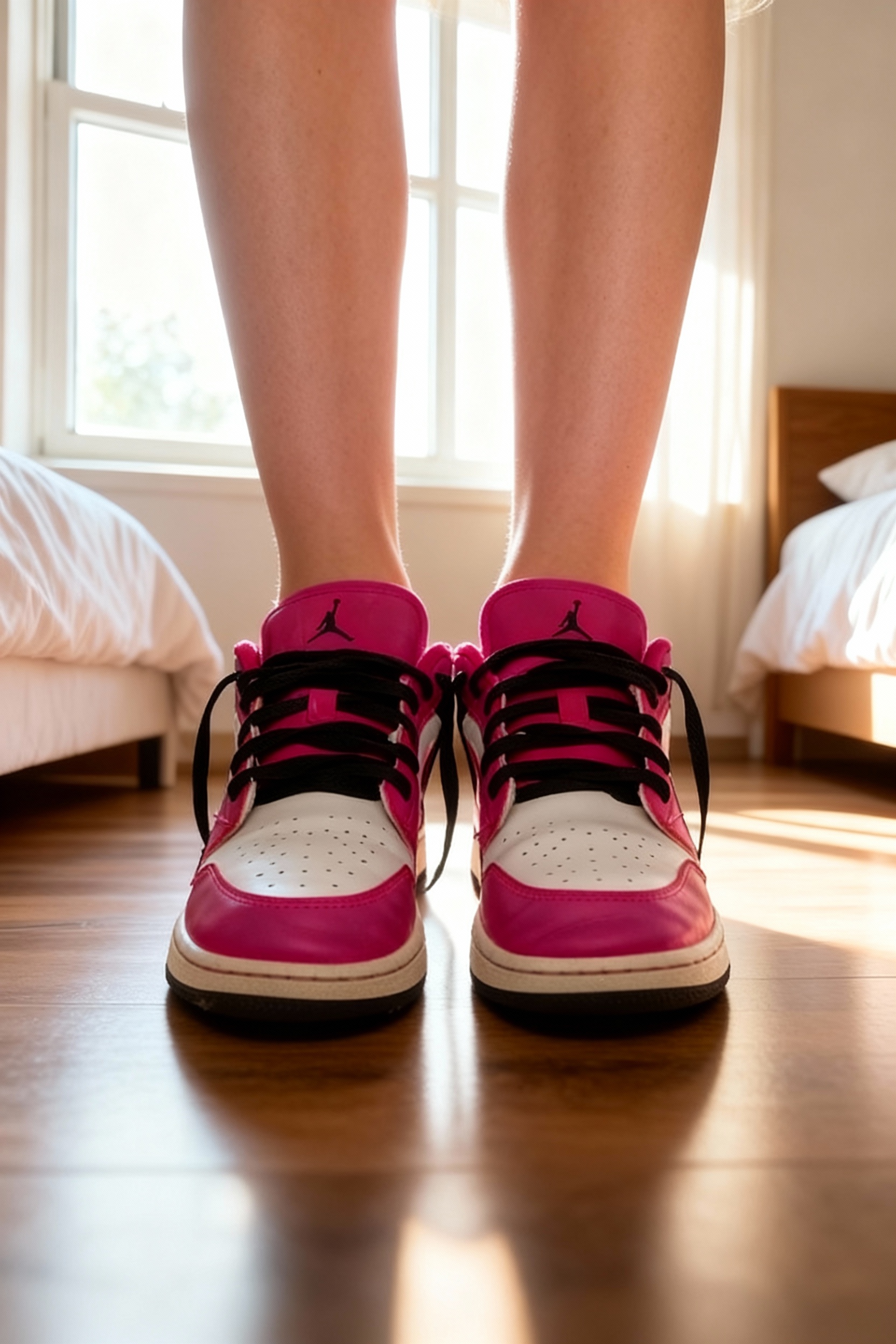 Air jordan 1 low ( gs ) debout, face à la caméra, dans une chambre à la lumière douce, avec une lumière naturelle filtrant par la fenêtre.