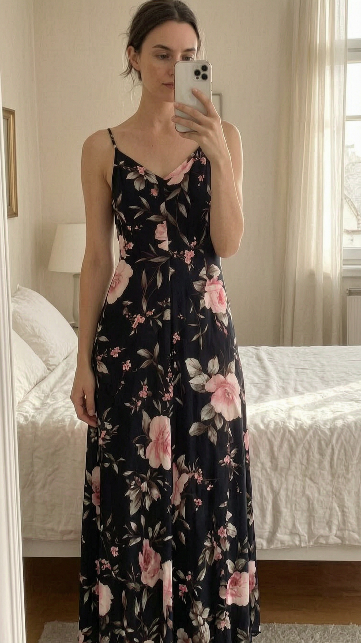 Alice & Olivia black floral maxi dress uk10 standing straight facing the camera, in a softly lit bedroom setting, with gentle natural light filtering through a window.