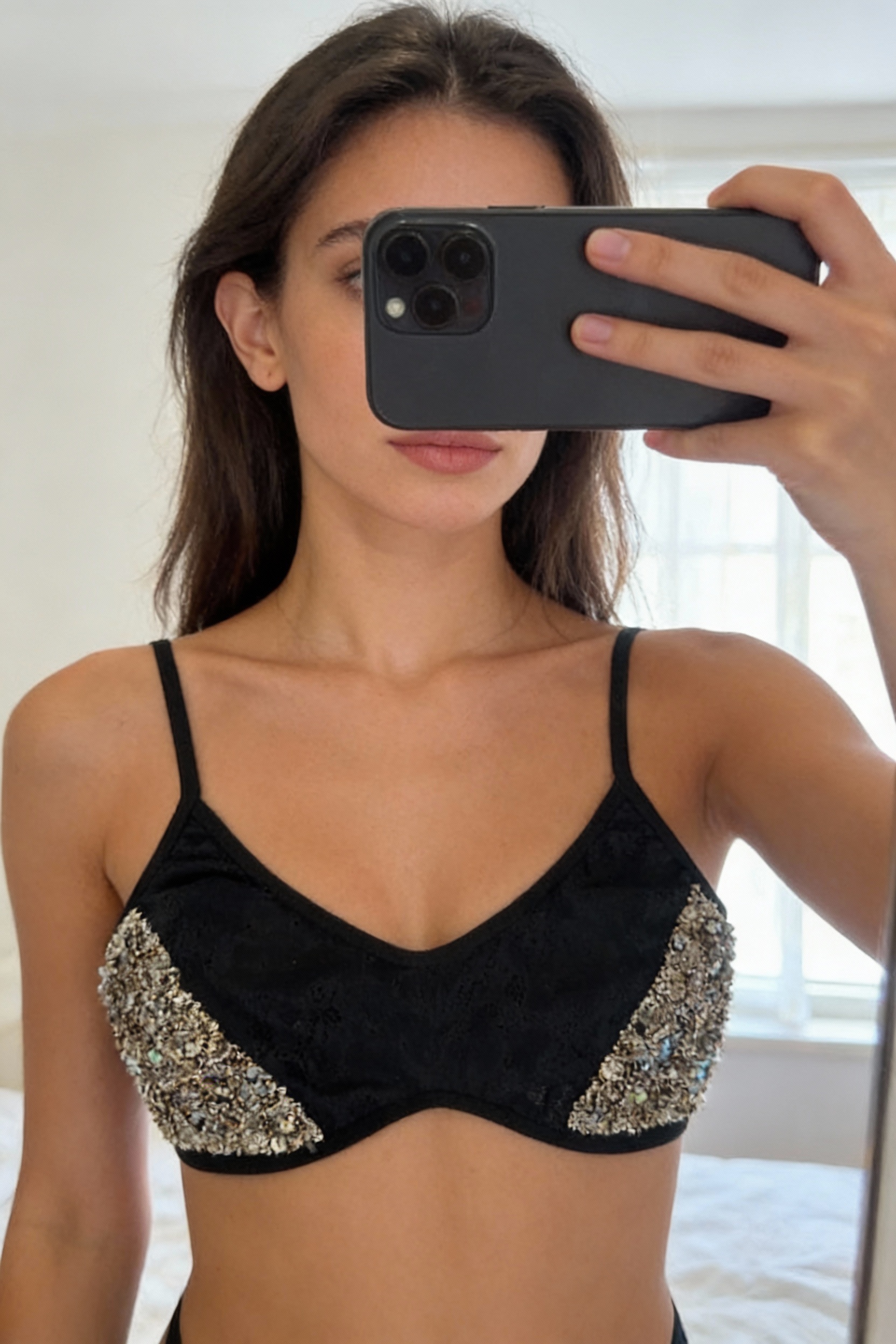 A person in All saints bra size 10 standing straight facing the camera, in a softly lit bedroom setting, with gentle natural light filtering through a window.