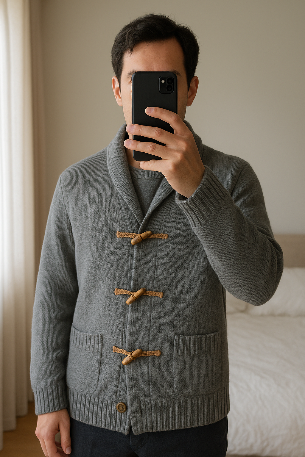 All Saints Spitalfields Men’s Grey Duffle Cardigan – Size S standing straight facing the camera, in a softly lit bedroom setting, with gentle natural light filtering through a window.