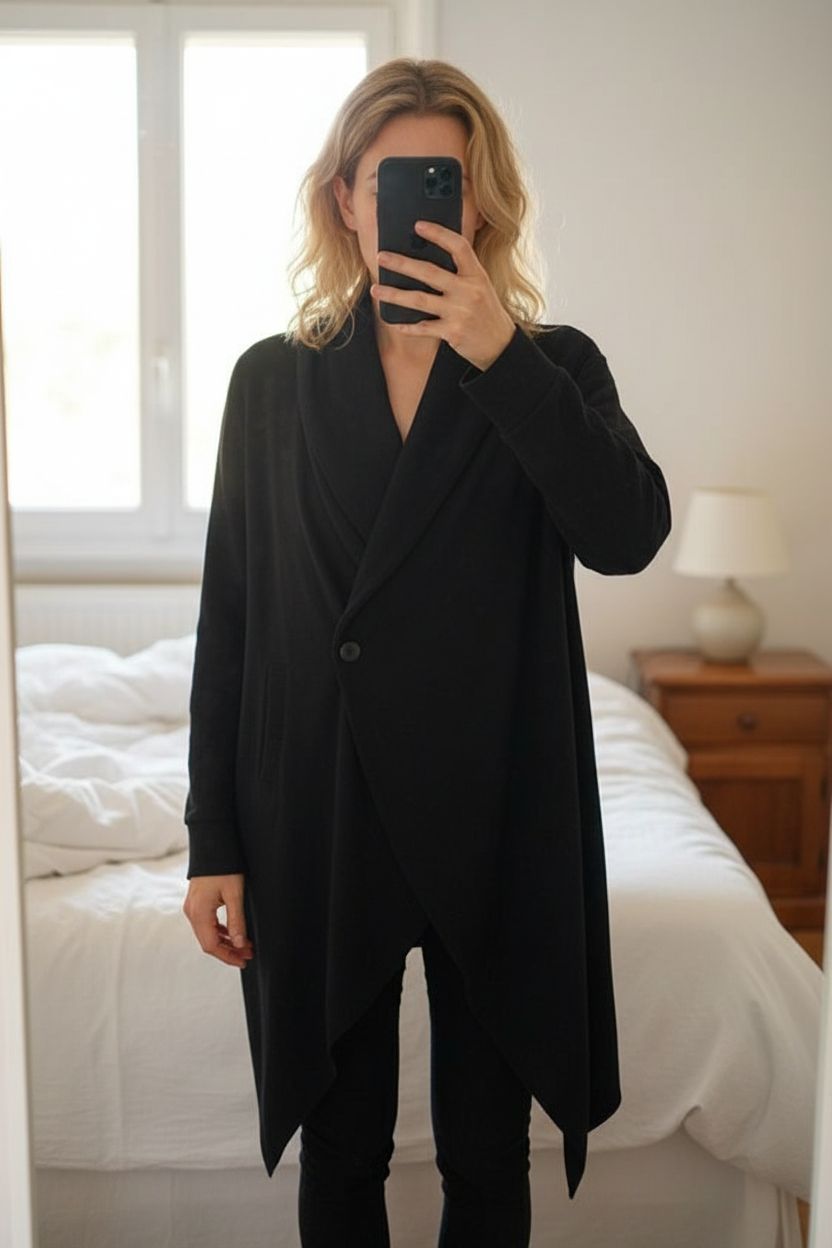 AllSaints Drapey Cardigan Medium standing straight facing the camera, in a softly lit bedroom setting, with gentle natural light filtering through a window.