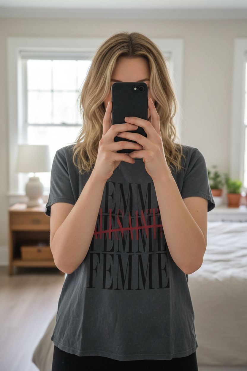 AllSaints “Femme” Graphic T-Shirt Grey Size S 100% Cotton New Without Tags standing straight facing the camera, in a softly lit bedroom setting, with gentle natural light filtering through a window.