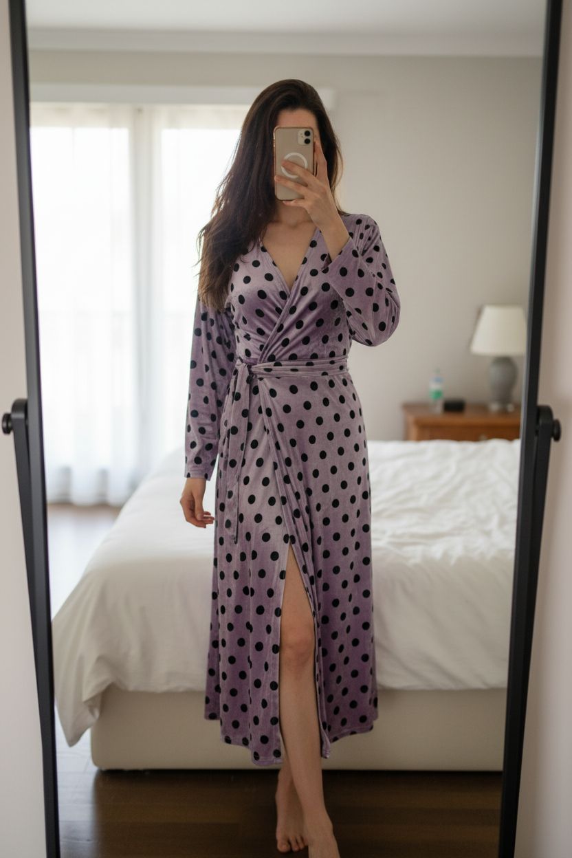 Alt Velvet Bodycon Midi Dress Batwing Sleeves Goth Pin-Up ASOS 10 standing straight facing the camera, in a softly lit bedroom setting, with gentle natural light filtering through a window.