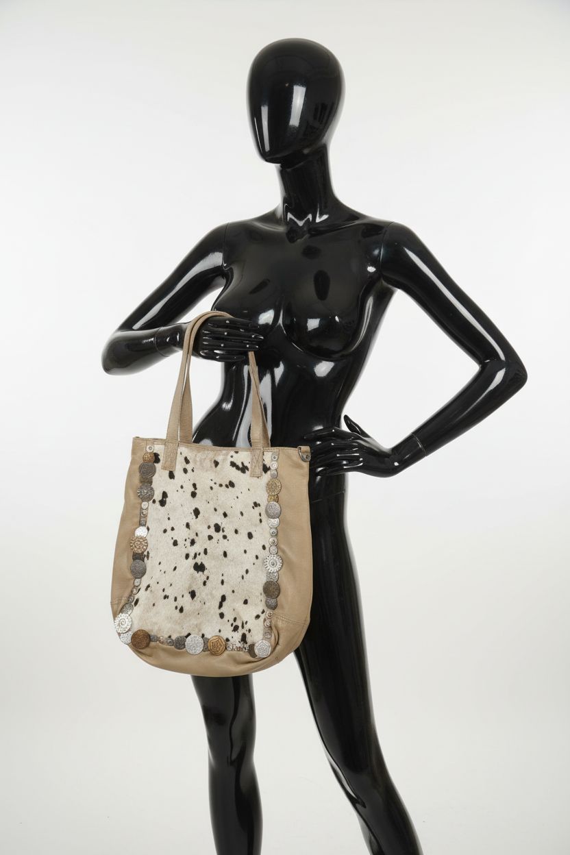 a glossy black plastic mannequin with no facial features in Anokhi Beige / Cream Unusual Pony Hair Front North South Bag arching their back slightly for a dynamic pose, in a clean photo studio with seamless white backdrop and softbox lighting.