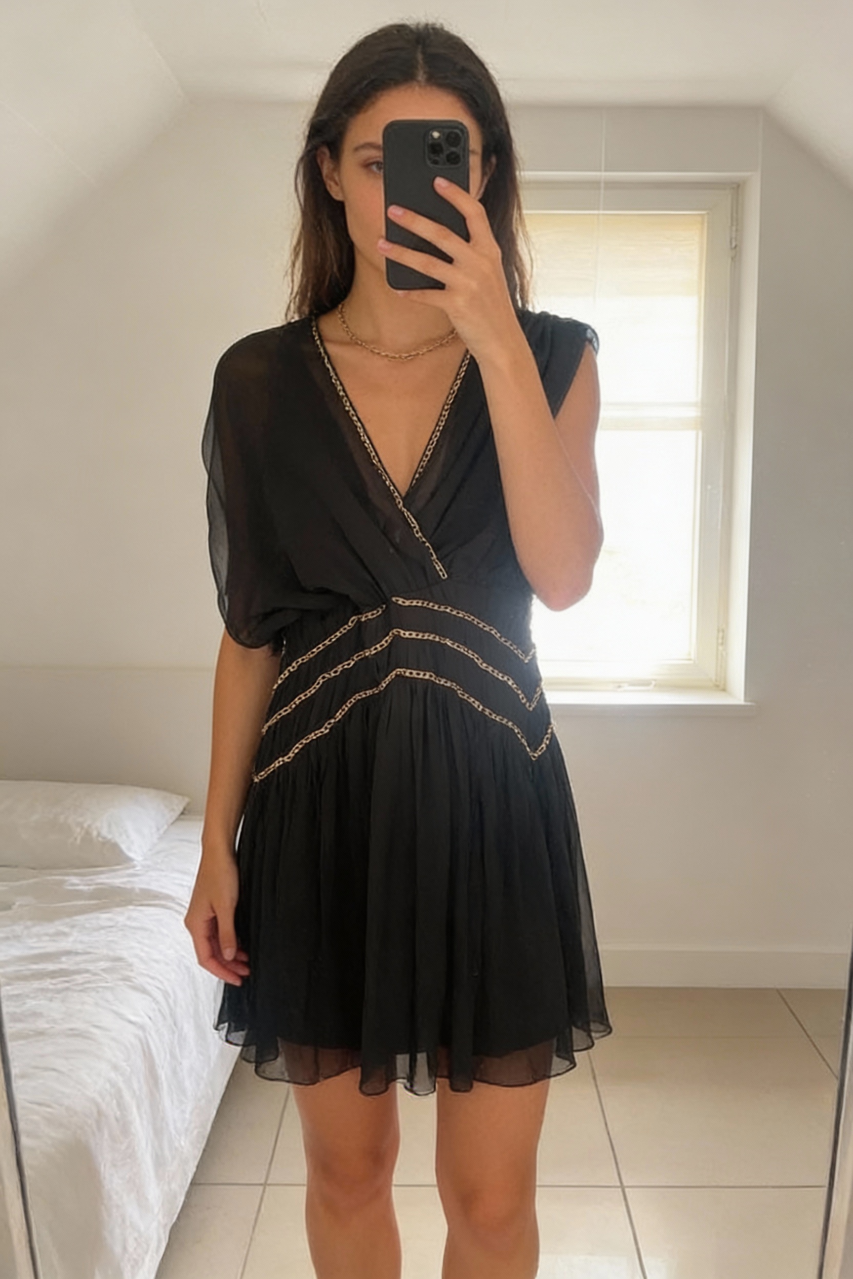 A person in ASOS design Grecian dress size 8 standing straight facing the camera, in a softly lit bedroom setting, with gentle natural light filtering through a window.