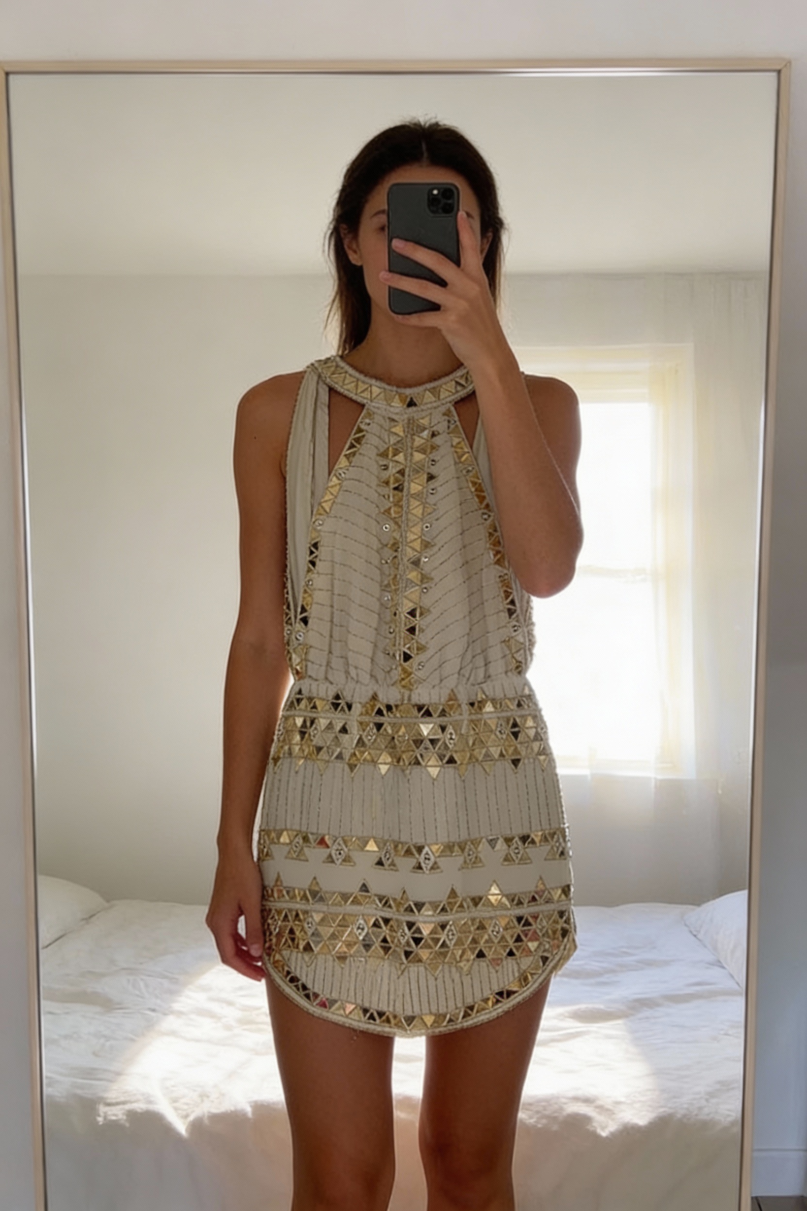 A person in Asos dress standing straight facing the camera, in a softly lit bedroom setting, with gentle natural light filtering through a window.