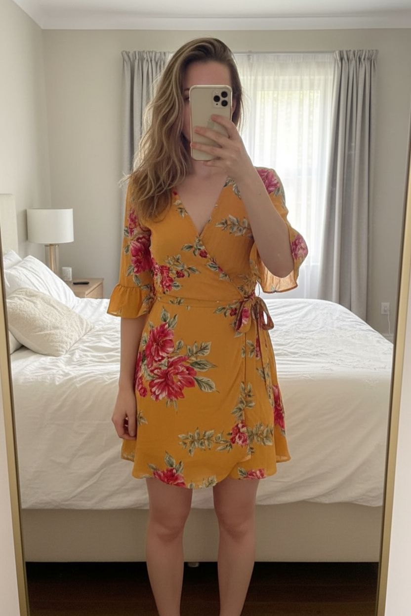 ASOS Influence Yellow Rose Wrap Mini Dress – Size 12 – Cottagecore / Coquette standing straight facing the camera, in a softly lit bedroom setting, with gentle natural light filtering through a window.