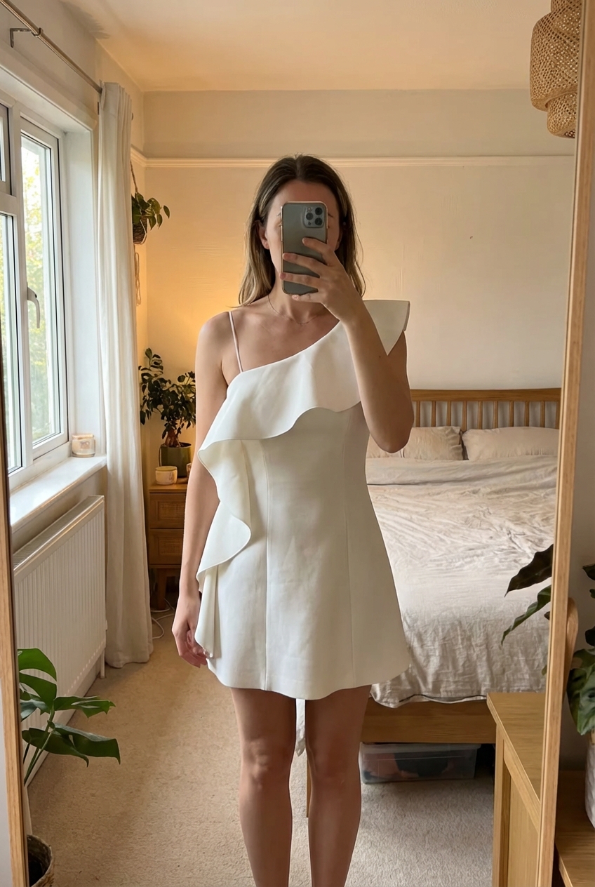 ASOS White One-Shoulder Ruffle Dress UK 6 New Without Tag standing straight facing the camera, in a softly lit bedroom setting, with gentle natural light filtering through a window.