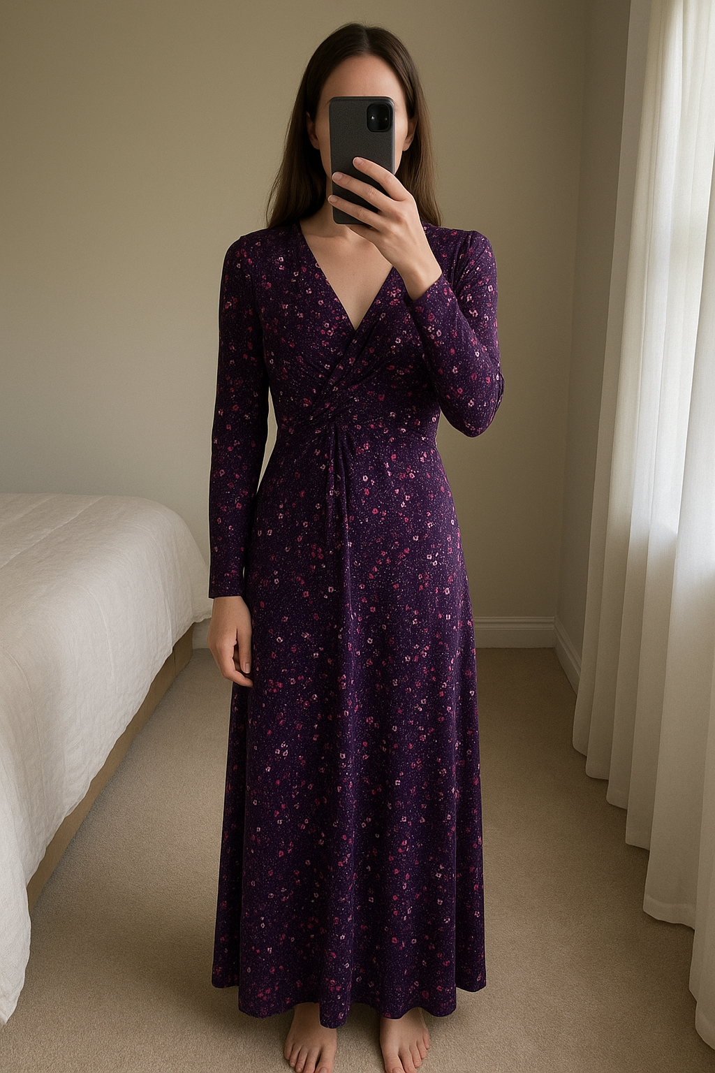 Aspiga Ashley jumpsuit - Size XS - new with tags standing straight facing the camera, in a softly lit bedroom setting, with gentle natural light filtering through a window.