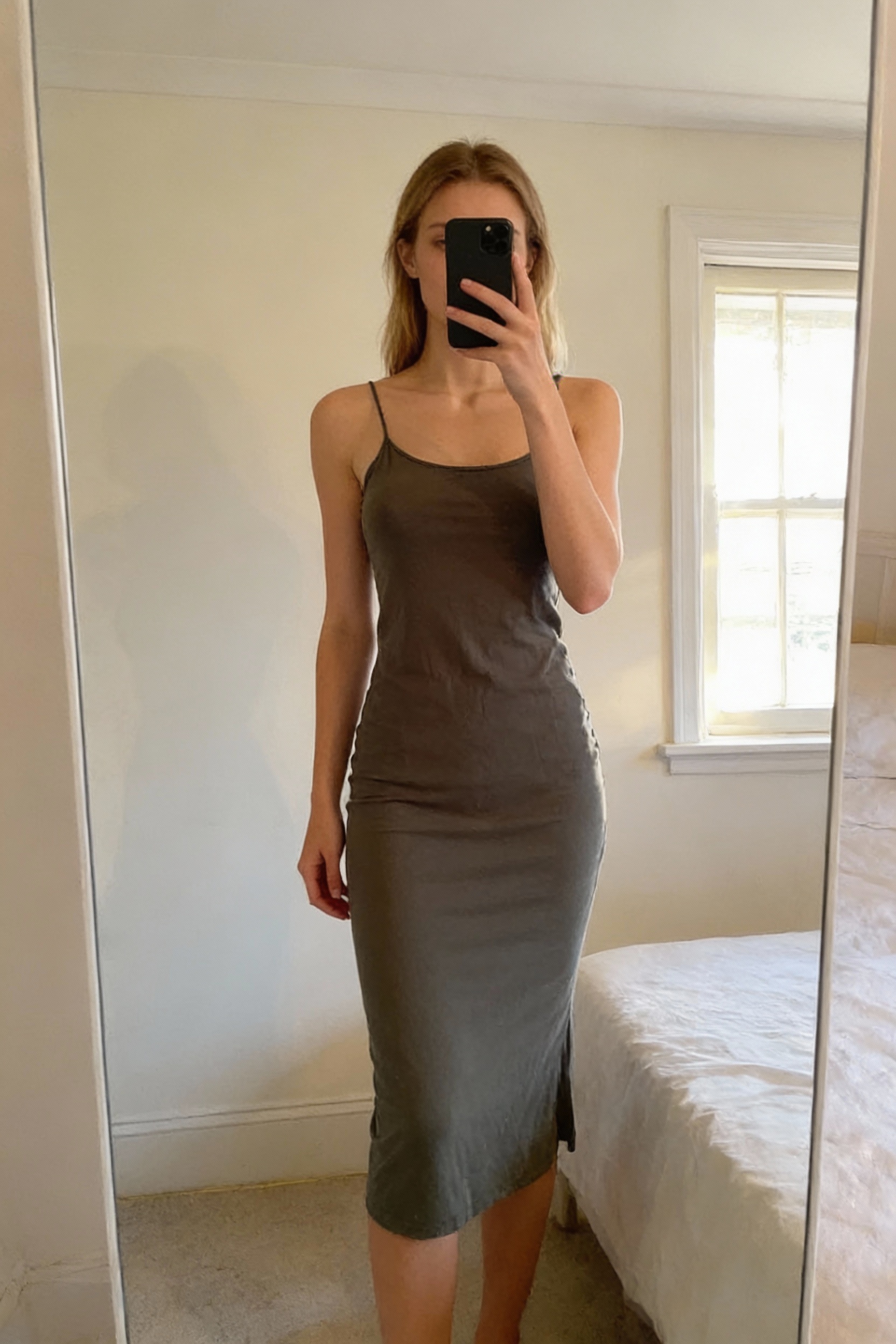 Atmosphere Khaki Cotton Cami Dress strappy longer length vest top/short mini dress size 6 standing straight facing the camera, in a softly lit bedroom setting, with gentle natural light filtering through a window.