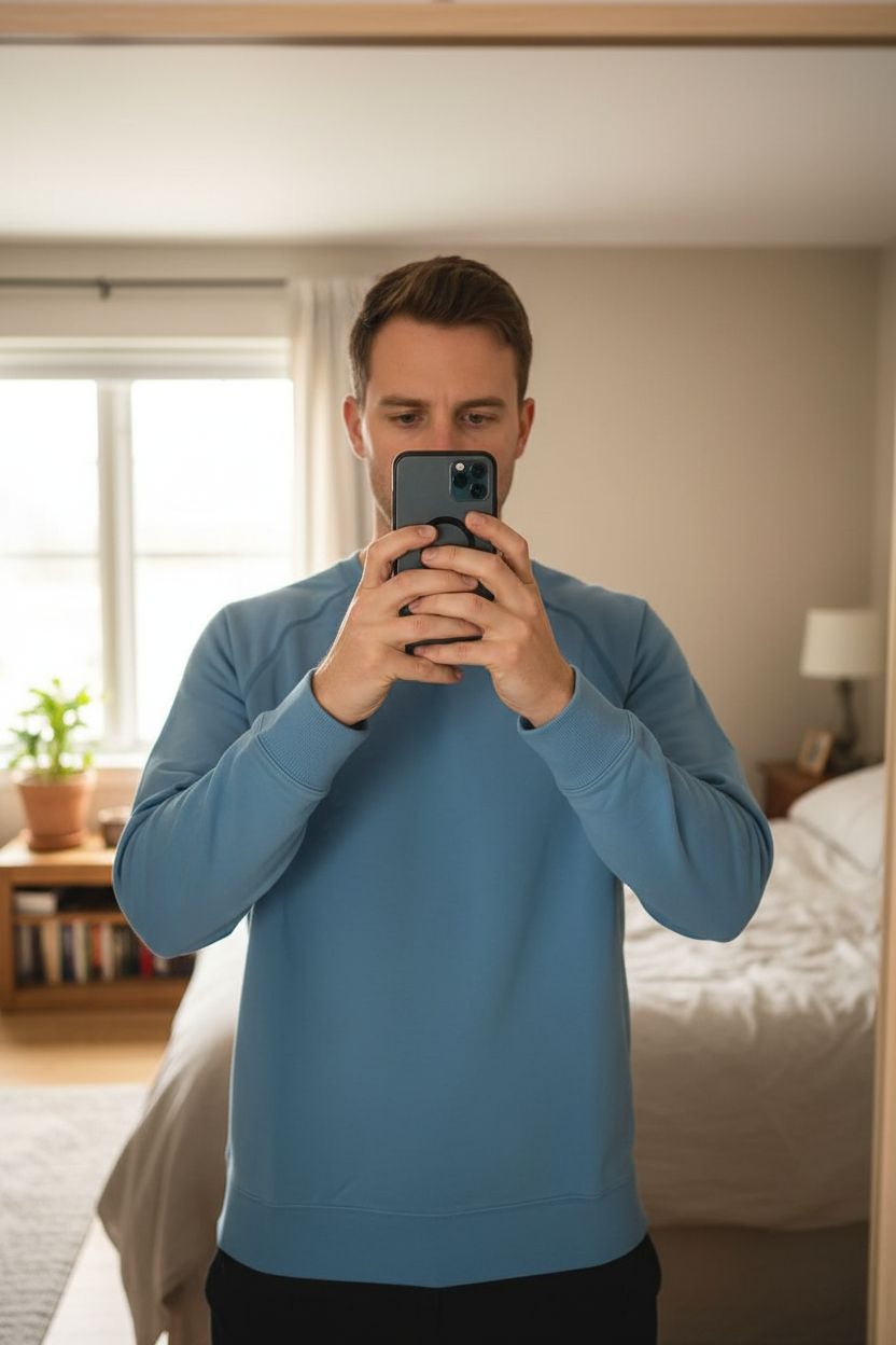 Autograph Light Blue Crew Neck Sweatshirt Size L (New Without Tags) standing straight facing the camera, in a softly lit bedroom setting, with gentle natural light filtering through a window.